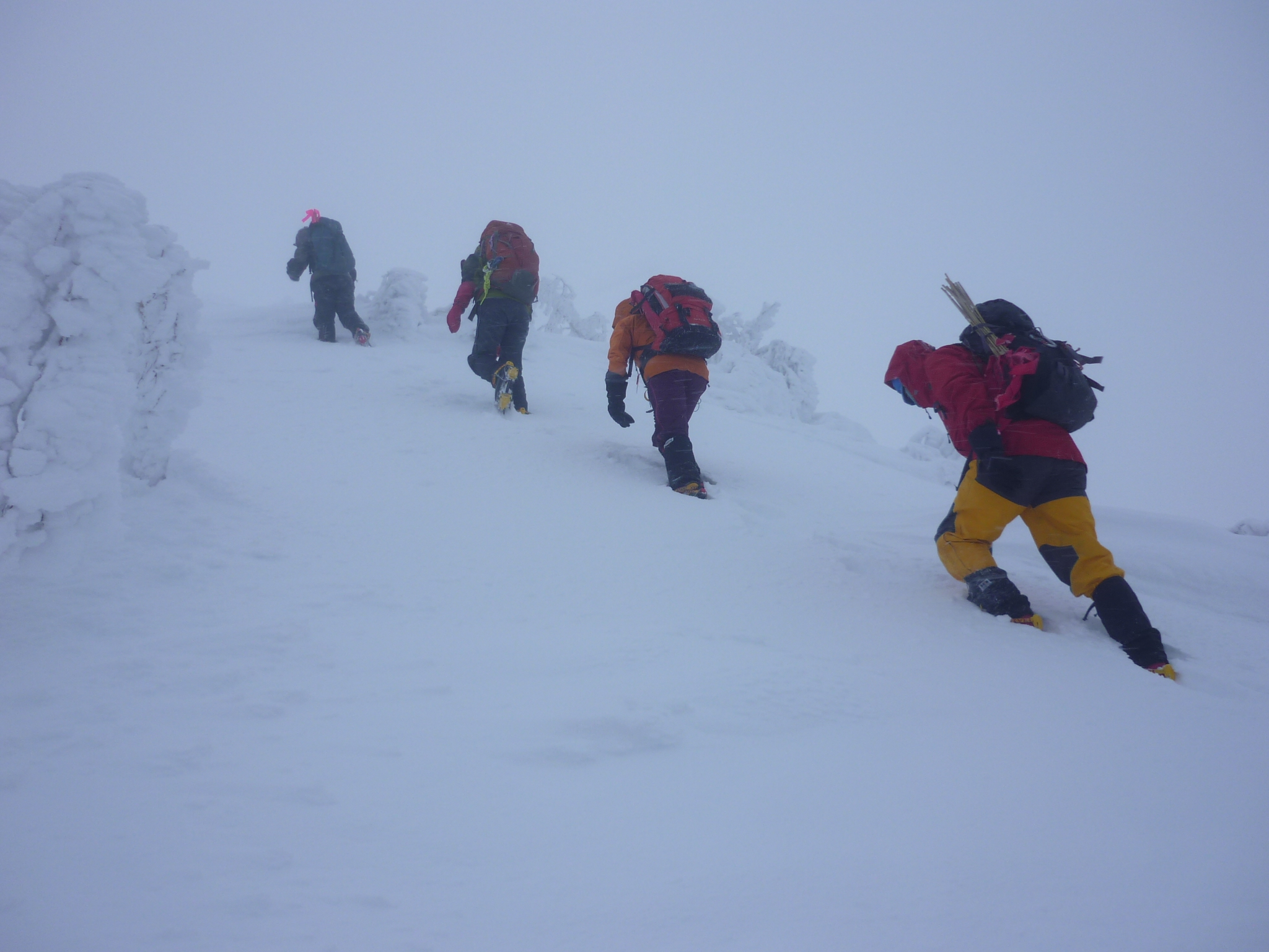 スキーをデポ、アイゼンに履き替え出発です。