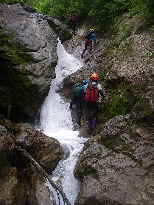 次に現れたのは5mほどの滝も水流右から。ガバは多いけれど不安なのでザイル使用。