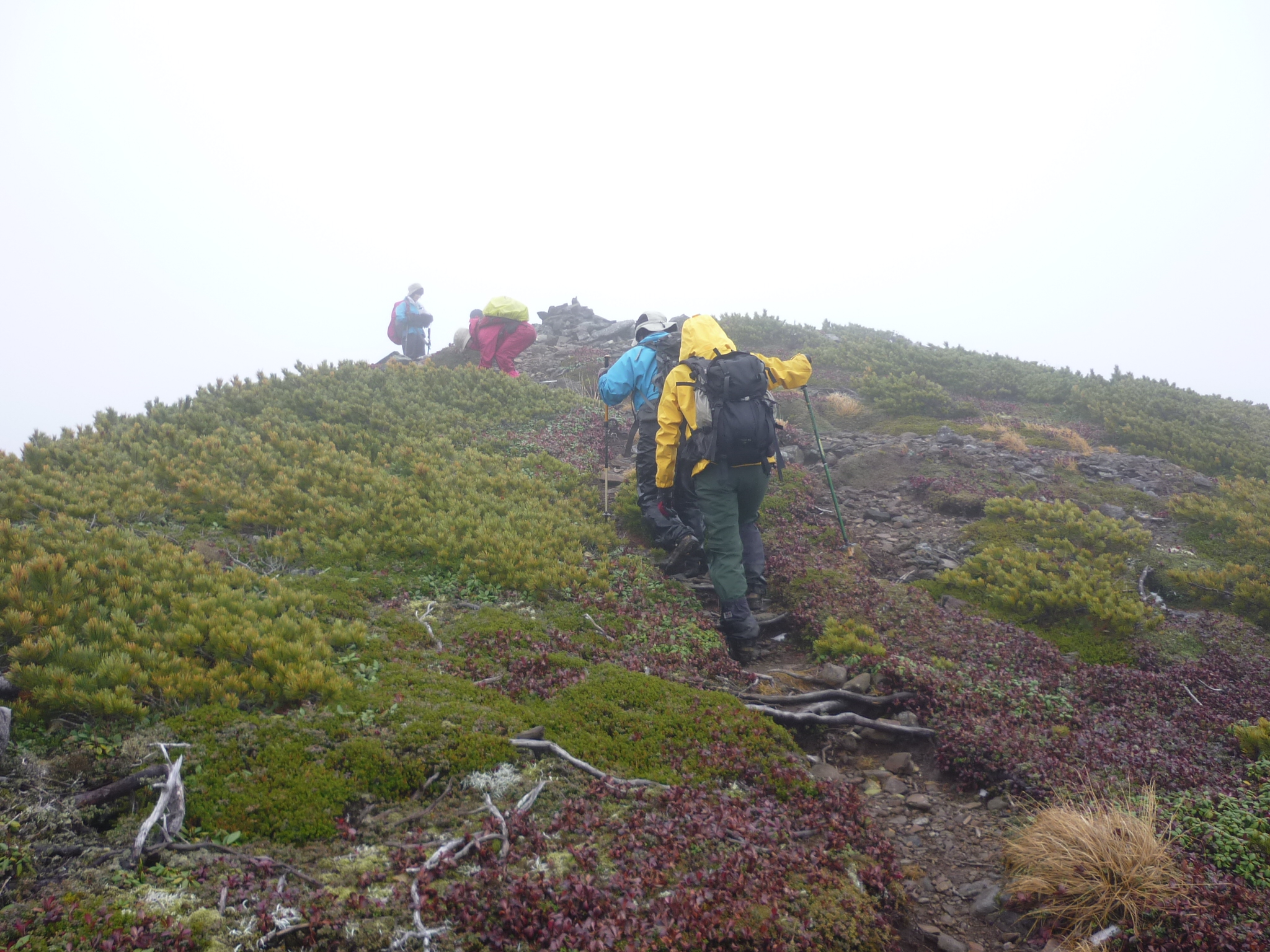 頂上です、ガスっていて展望はありませんが、雨が降らないだけ良しと。