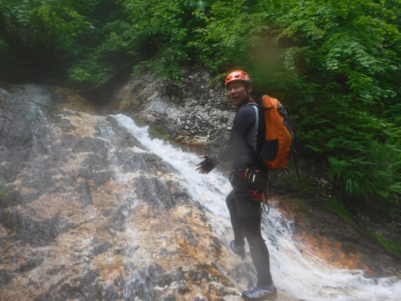 ゴルジュで相談。入門者Tさん、直登希望で。 じゃー行こう。ちょっと寒いけど。 シャワーあびまくり。