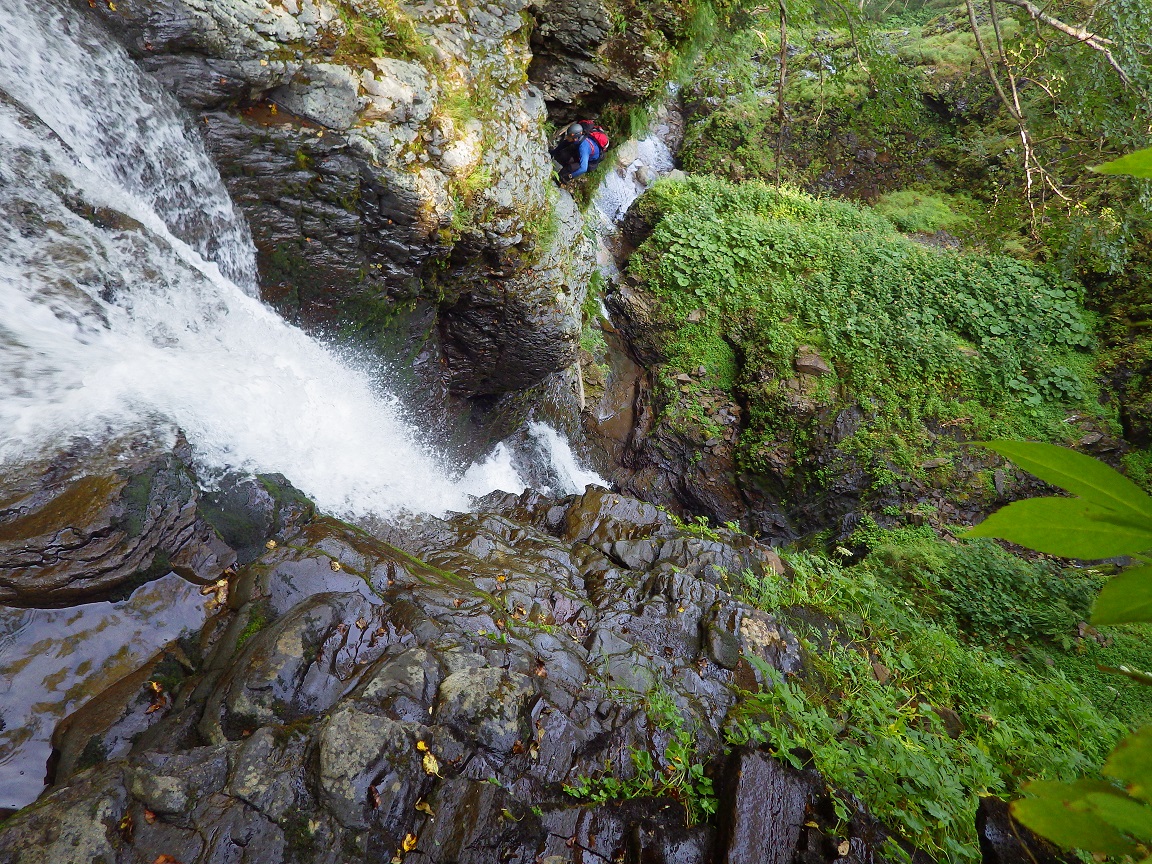 向かって左を、木の枝を頼りに40mほど高巻きましたが、