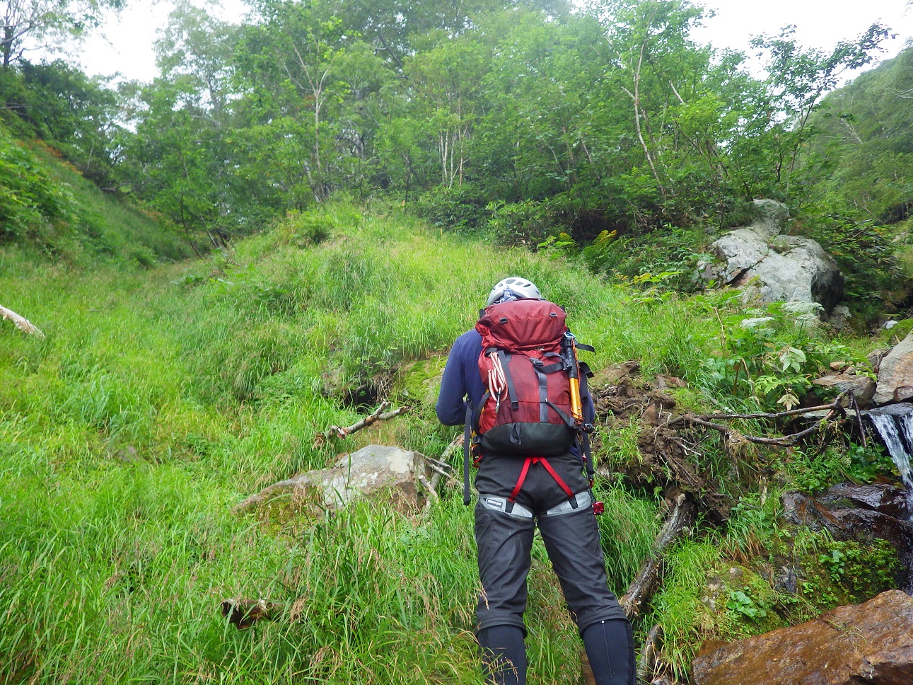 不明瞭な沢筋を北東面沢に向かって降りていきます。