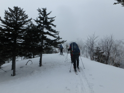 クラストした斜面を行きます。カリカリした雪面に昨晩降った新雪が薄らのっています。