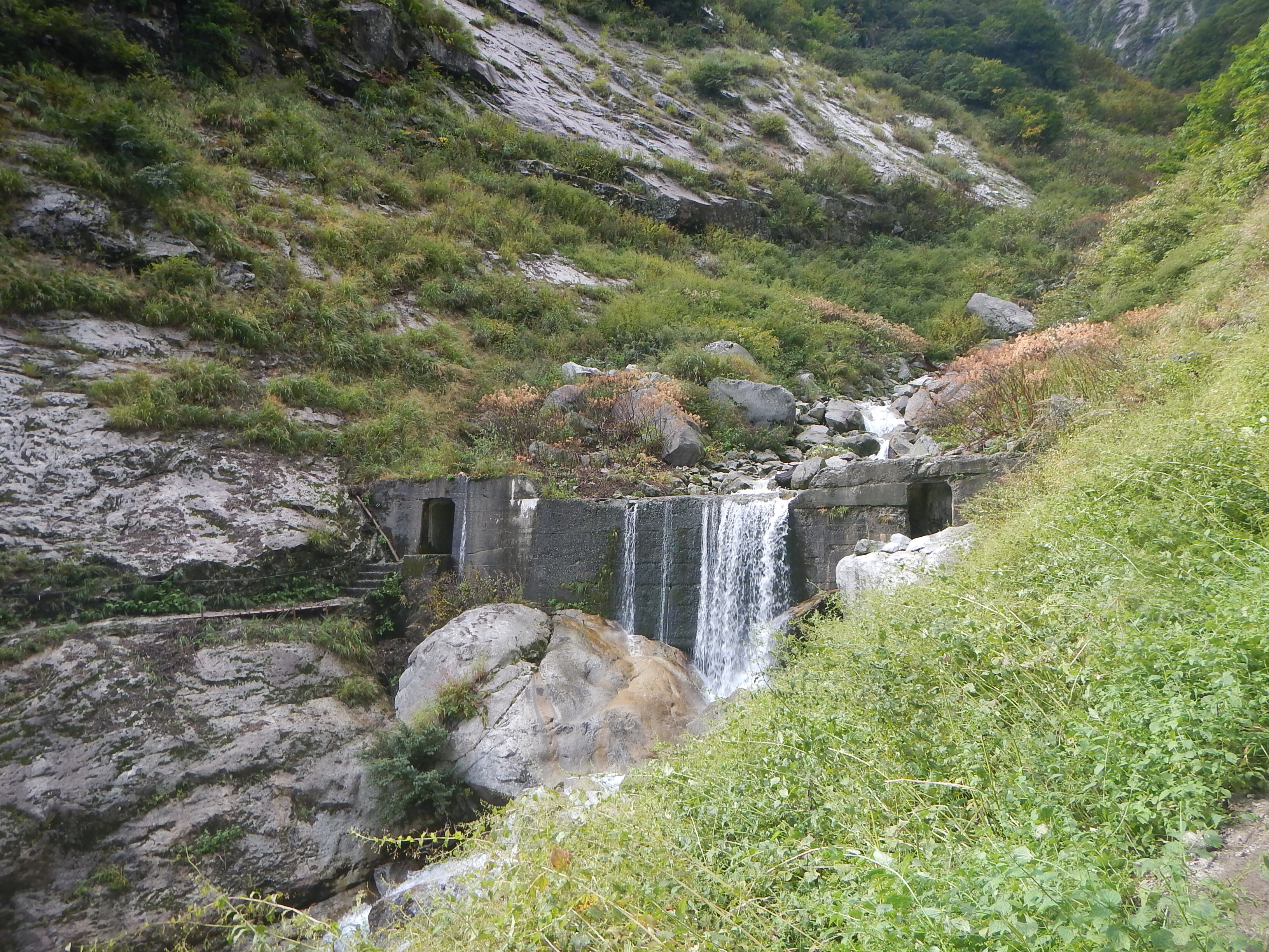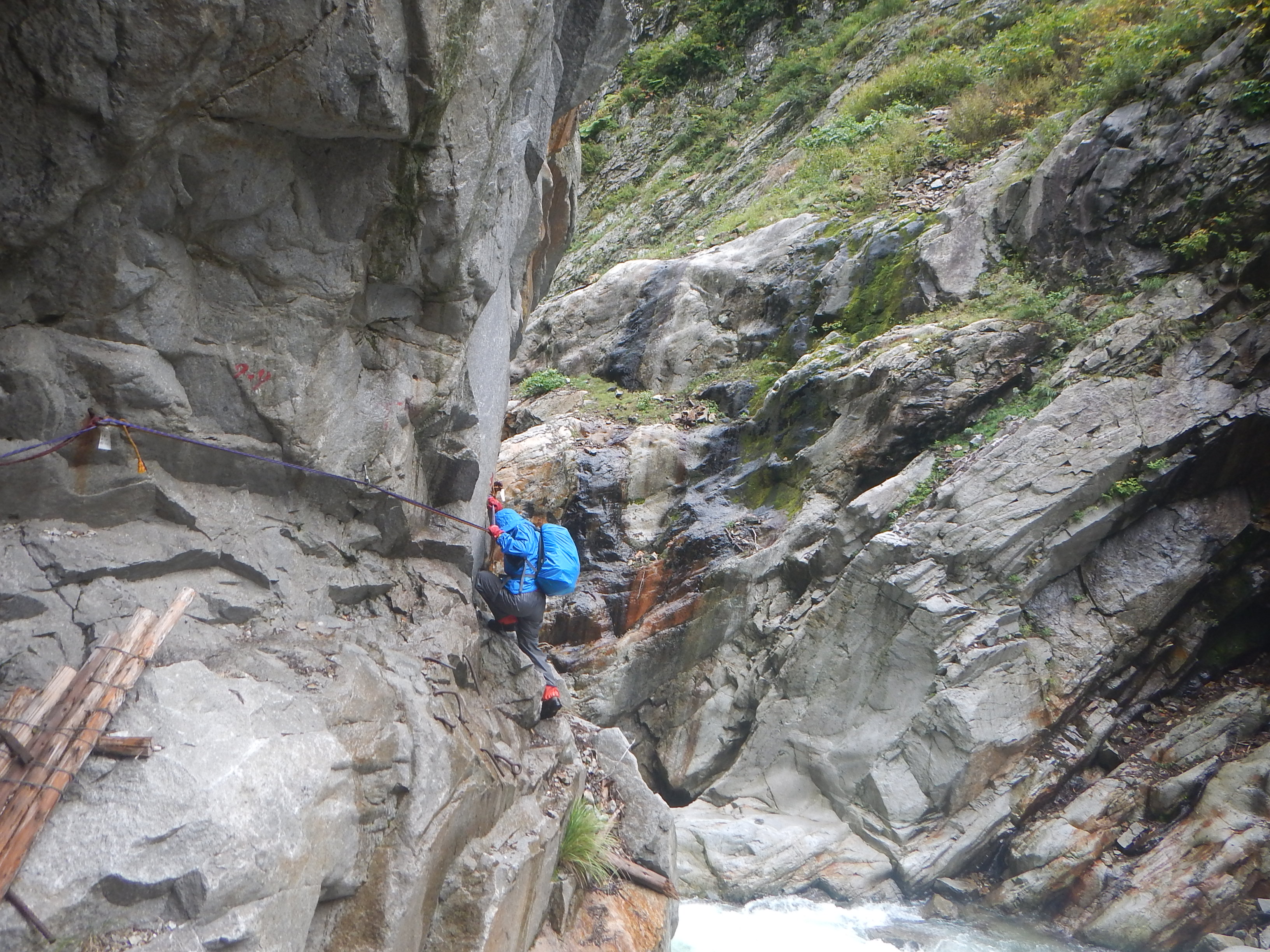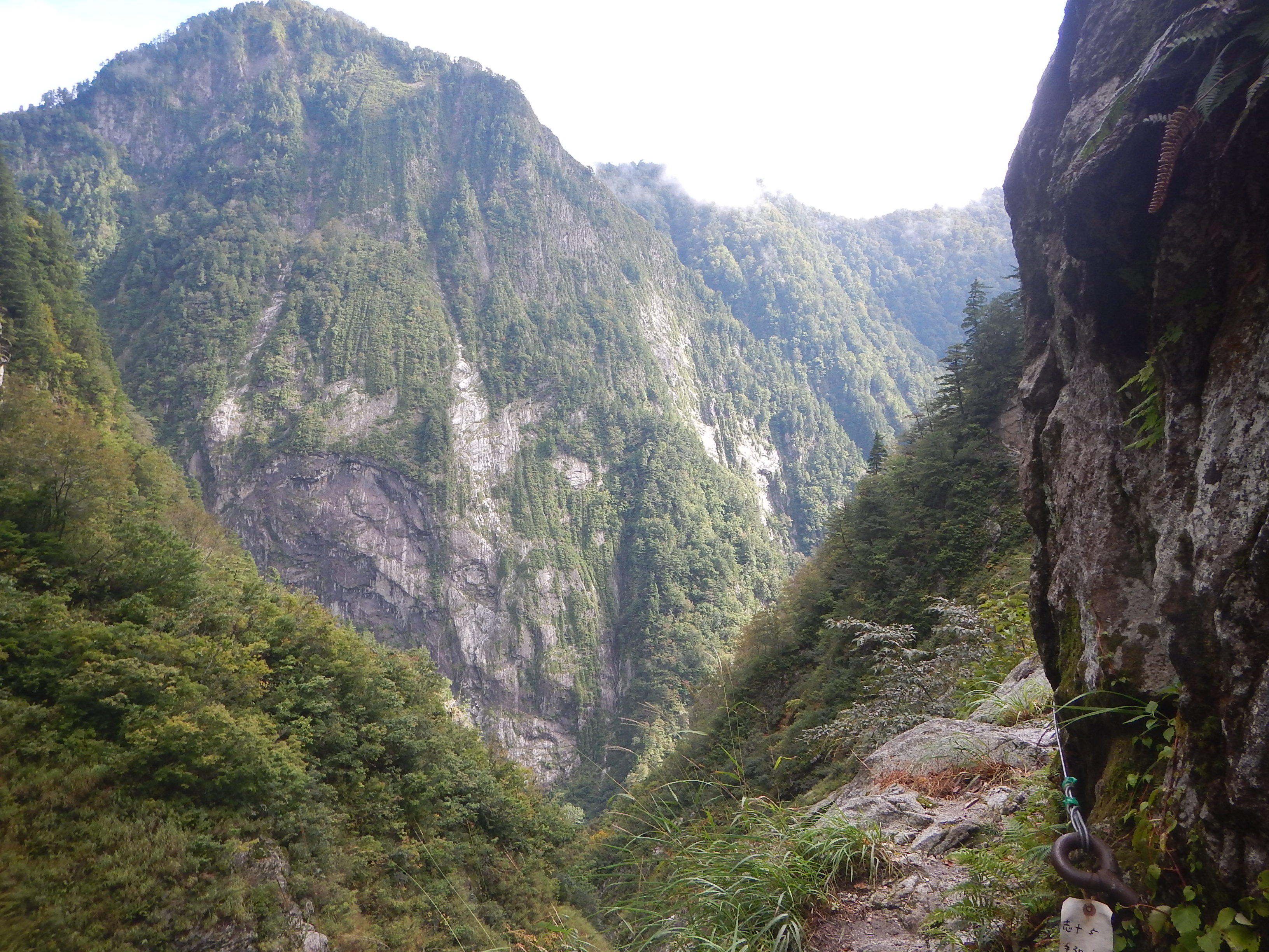 翌朝欅平に向けて出発、阿曽原温泉小屋とキャンプ場を望む。欅平までは俗に言う水平歩道を歩く、今日も長い距離だが昨日より天気が良いから助かる。