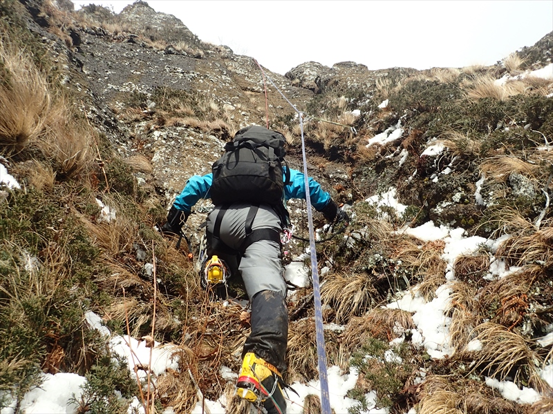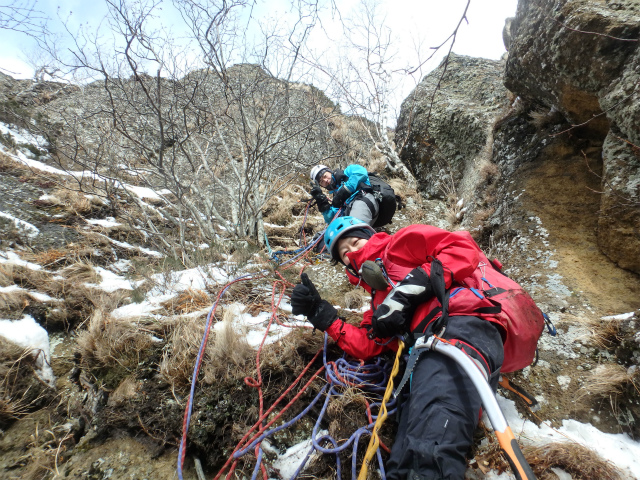左リッジは1P目の下部の、白スリングが垂れている灌木の乗り上りがややむずですが、それ以外は草付にアックスが気持ちよく決まります。中央クーロアールに先行がいるときのバイパスルートとしていいかもしれません。