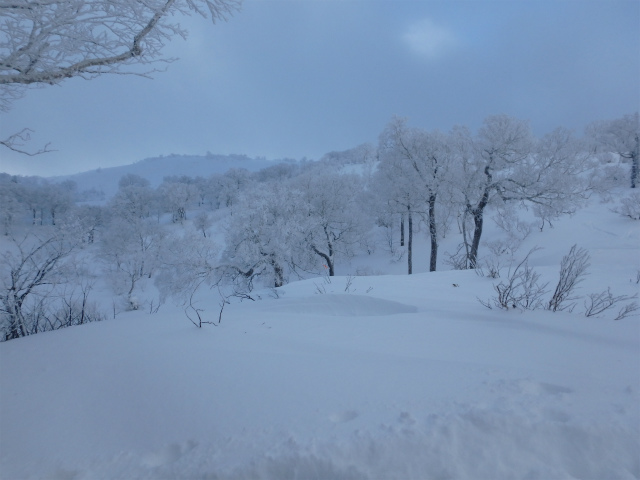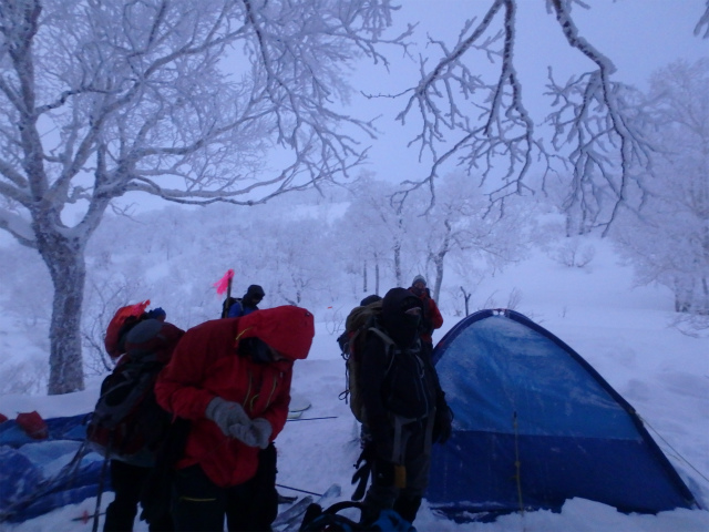 大雪で街中は大渋滞、諸々ハプニングもありながら、国際スキー場に2P、11名が集合しました。新人は二人、ツアー入門のフォローでゴンドラの終点駅から泊装備を背負いましたが、わずか20分ほどでサイト予定地に到着しました。朝里岳の手前1,120m地点です。