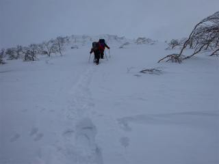 傾斜も強くなってきたので、わかんに履き替える。西尾根上はテントを張る場所はあるが、ただ風が強そうだ。