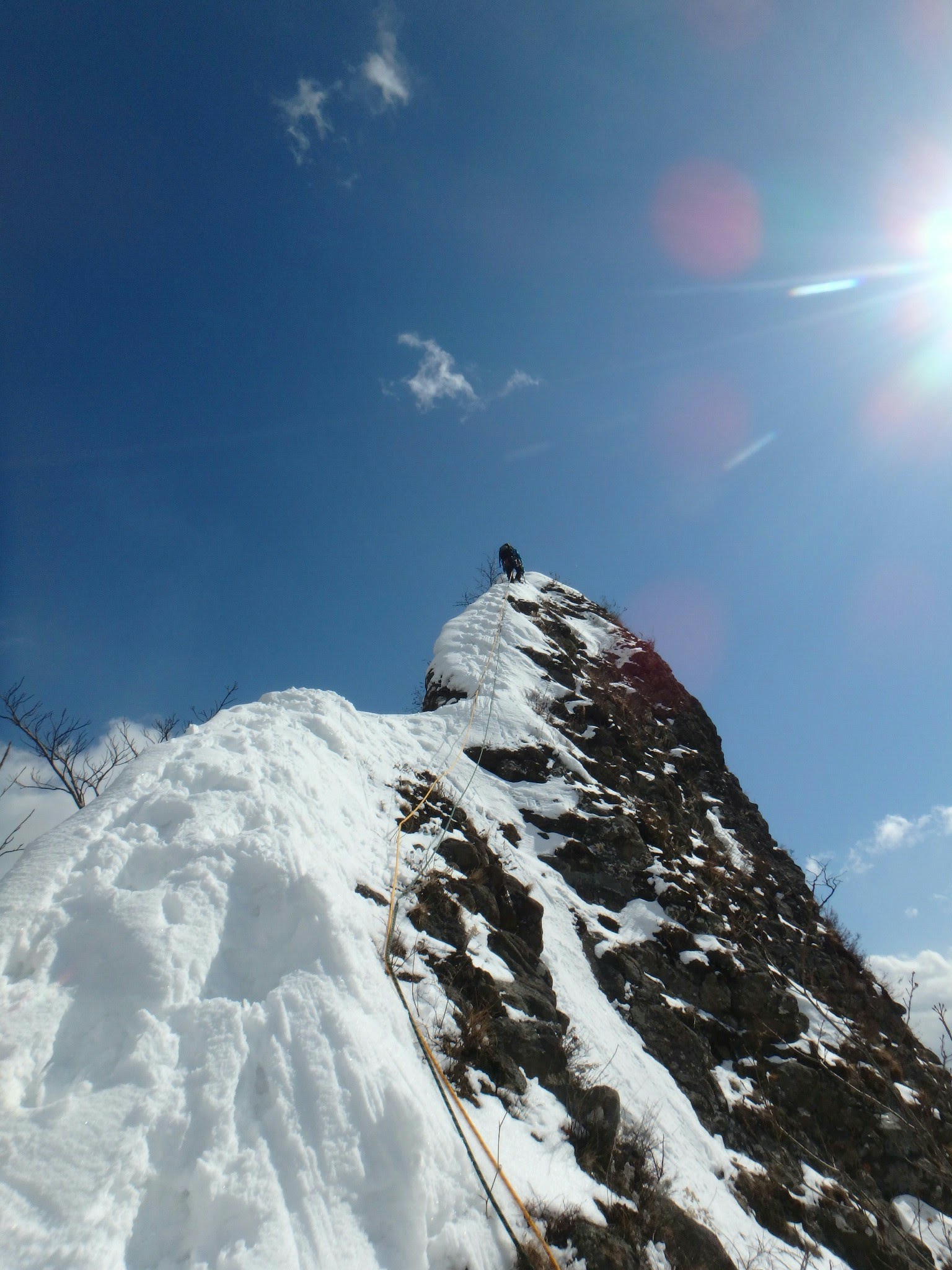 その後はずっと細いリッジで、雪庇が張り出していたら気持ち悪いところだが、ほぼ落ちてしまっていた