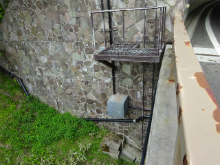 往路を戻り、覆道側に登ると梯子があり、道道へ上がれる。