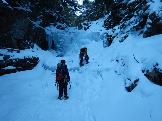 今年度の登攀企画部のお楽しみ、アルパインアイスがやってきました! アルパインアイスを平たく言えば、凍った沢登り。アイゼン、アックスを使いながら沢から山頂を目指します。夏には登れない滝も凍ると登れたりします。帰ってきて思うのは、北海道にこれがほとんどないのは誠に残念、ということです。東京にいたときは結構通ったものだが・・・。今回行く沢はアルパインアイスでは入門~初級レベルである。
