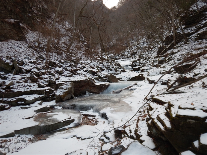 金山沢右俣に入る。岩の上にうっすら雪が被り、冬靴だと歩きづらい。