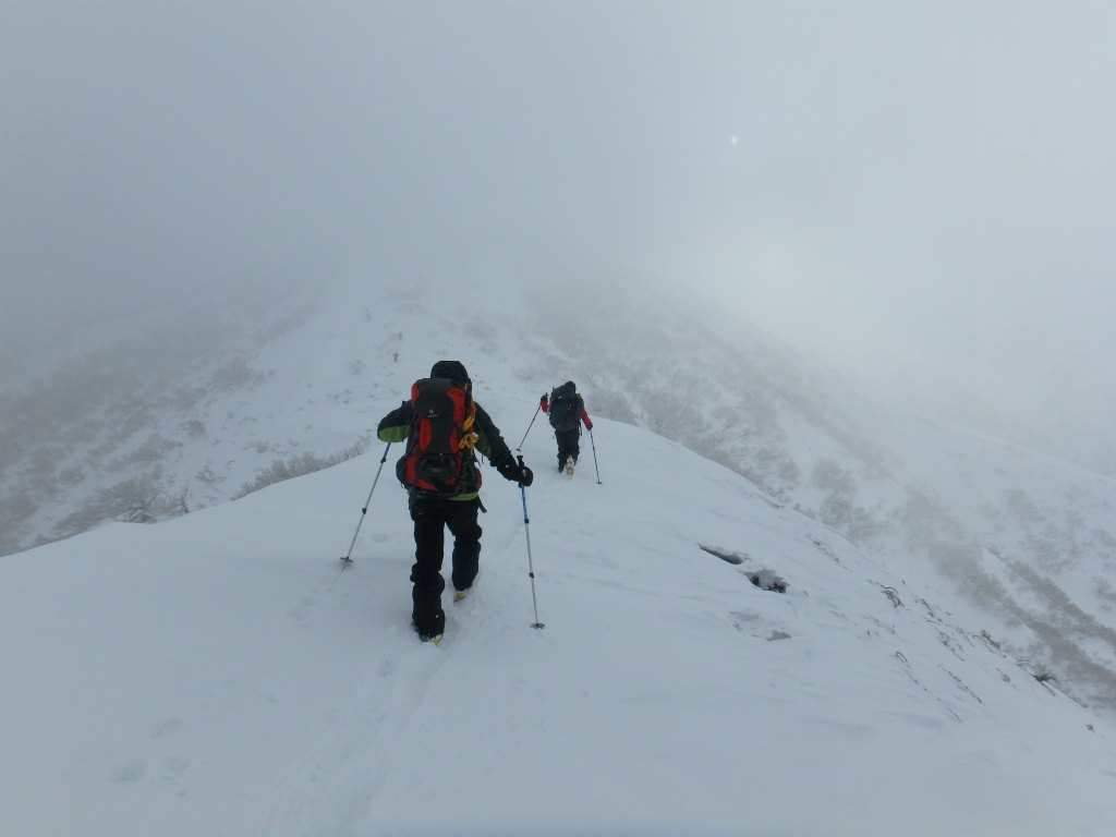 痩せた稜線を行きます。雪は安定しています。