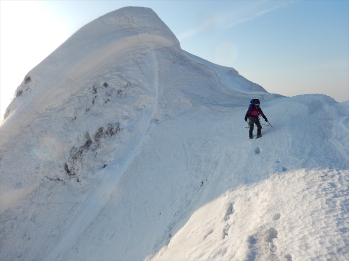 ただ時間とともに雪が再び腐り始め、念のため南峰まででロープを2か所出しました。雪が固ければ出さないと思います。