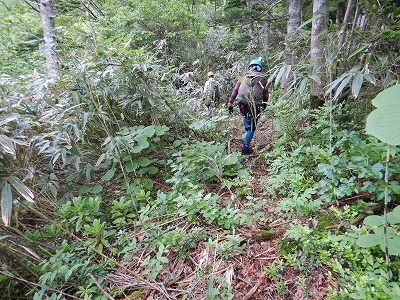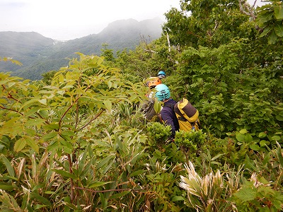 コルから更に藪を漕いで頂上へ。先頭は剪定はさみで蔓を切りながら。