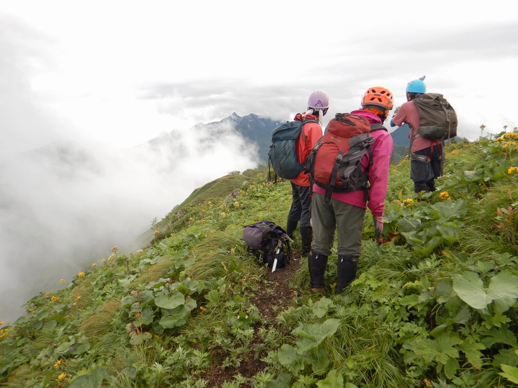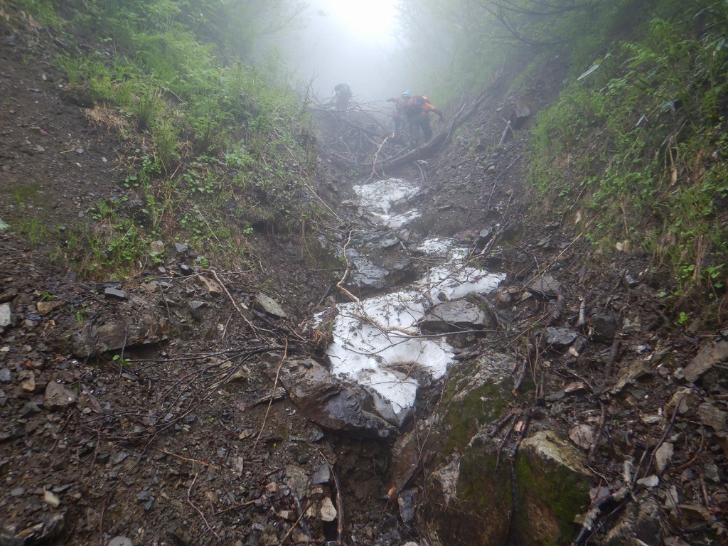 沢筋を登っていくが、沢筋が無くなると途中から沢靴に軽アイゼンを付けたり、スパイク地下足袋に履き替えたりするが、急な斜面にはそれが効果を発揮する。