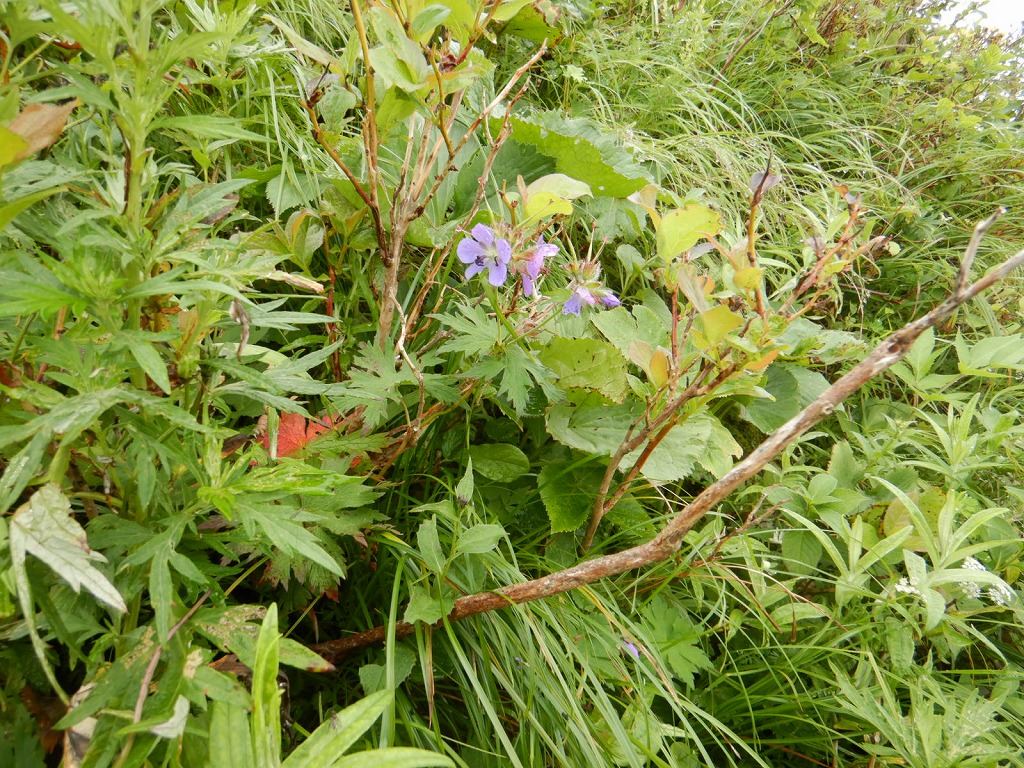 お花に囲まれた頂上到着です。鹿道が走り、三角点もありました。