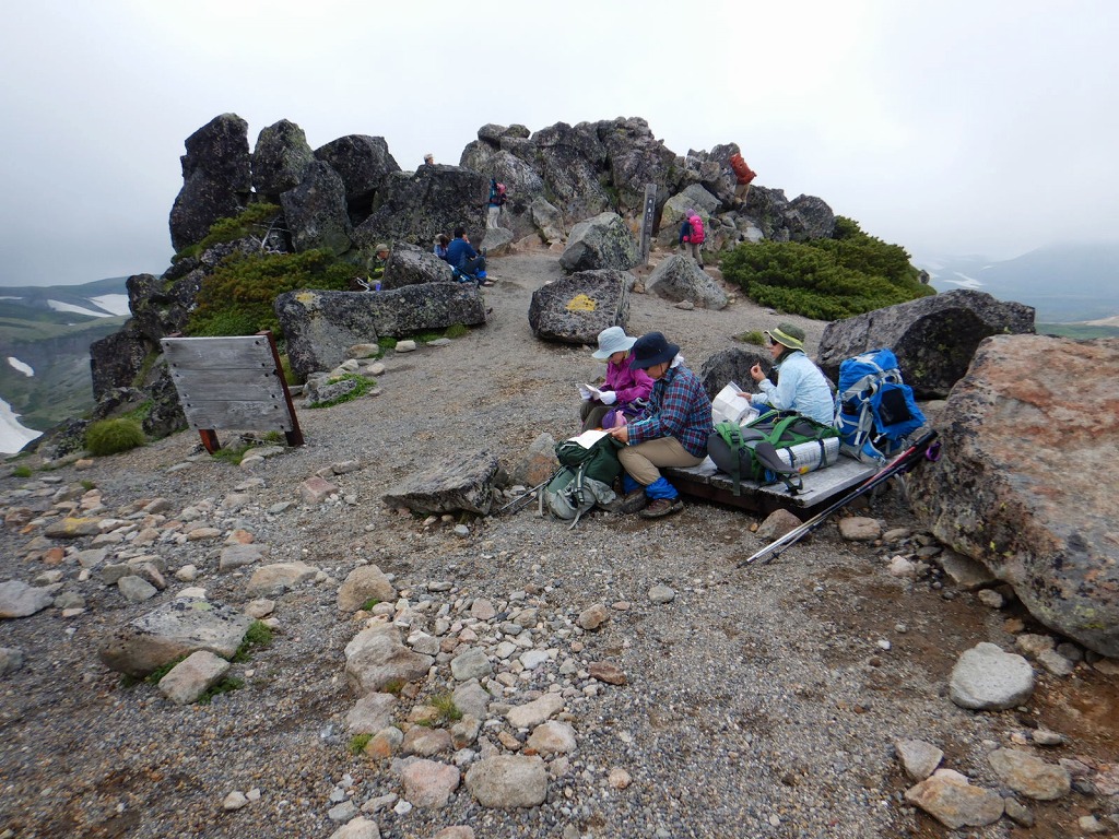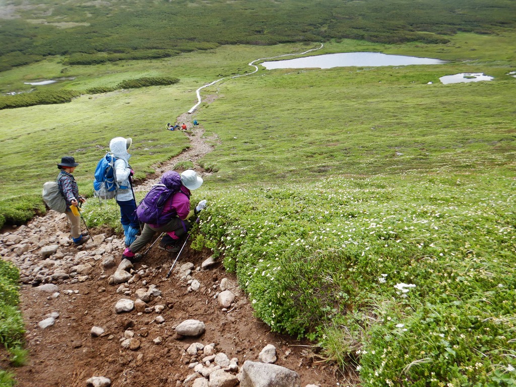 黒岳からの下りもお花が満開でした。下りでH子さんは、昨年に続き今年もまた以前屋久島でお世話になった人に逢いました。奇跡に近いですね。S井さんは体力がありますね。とにかく話題の絶えない楽しい三日間のお花見山行でした。