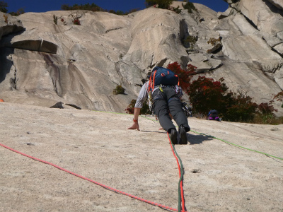 1ピッチ目 広いクラック40m、 5.6-5.7 真ん中の大きなクラックを朋ちゃんがリードします。