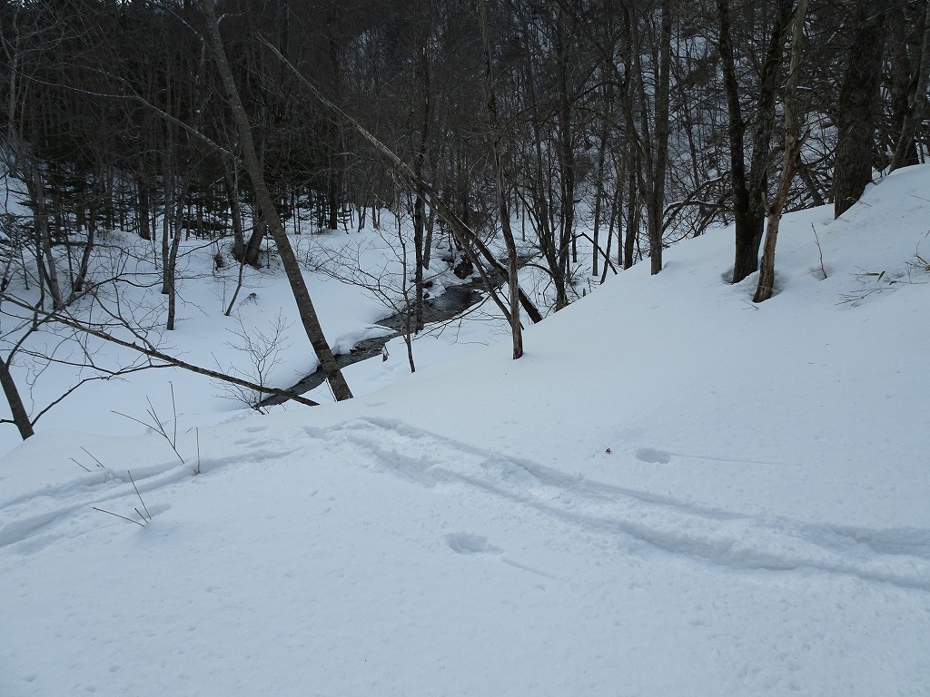 林道は崩れているところもあったが、やがて川にぶつかって途切れる。