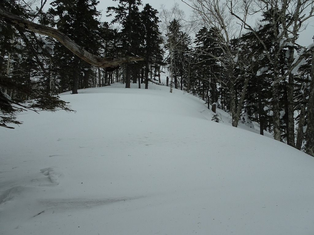 林道入り口が見えてきた。急傾斜と木々のうるささ、スノーシューで正解だった。展望も無いので一人ではめげる登山だった。