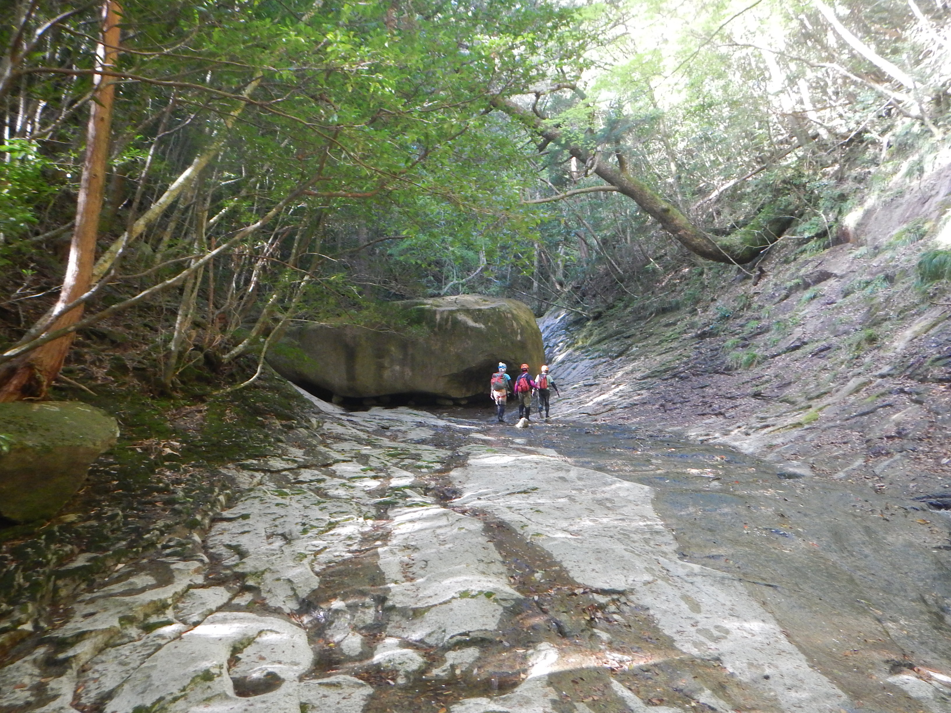 入渓して間もなく、キツイ滑り台のような長さ50mのナメ滝に出合う、なかは行かず左岸を進む