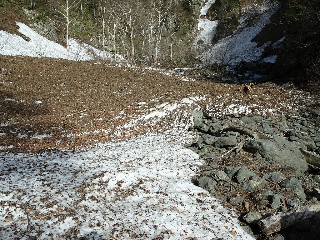 ゴルジュに到着、まだ開いていない。開いている場合は手前右側のロープの所を登る。