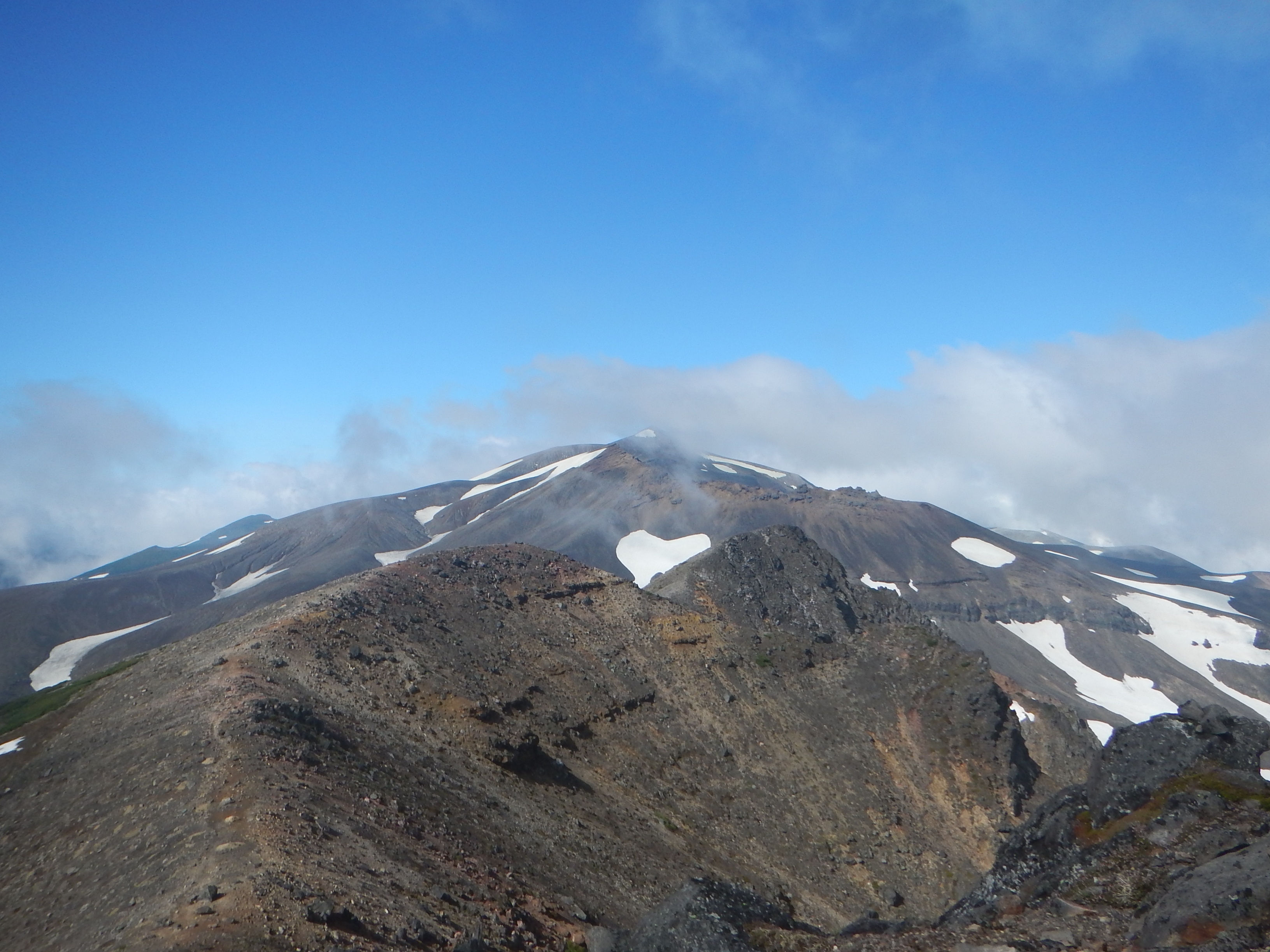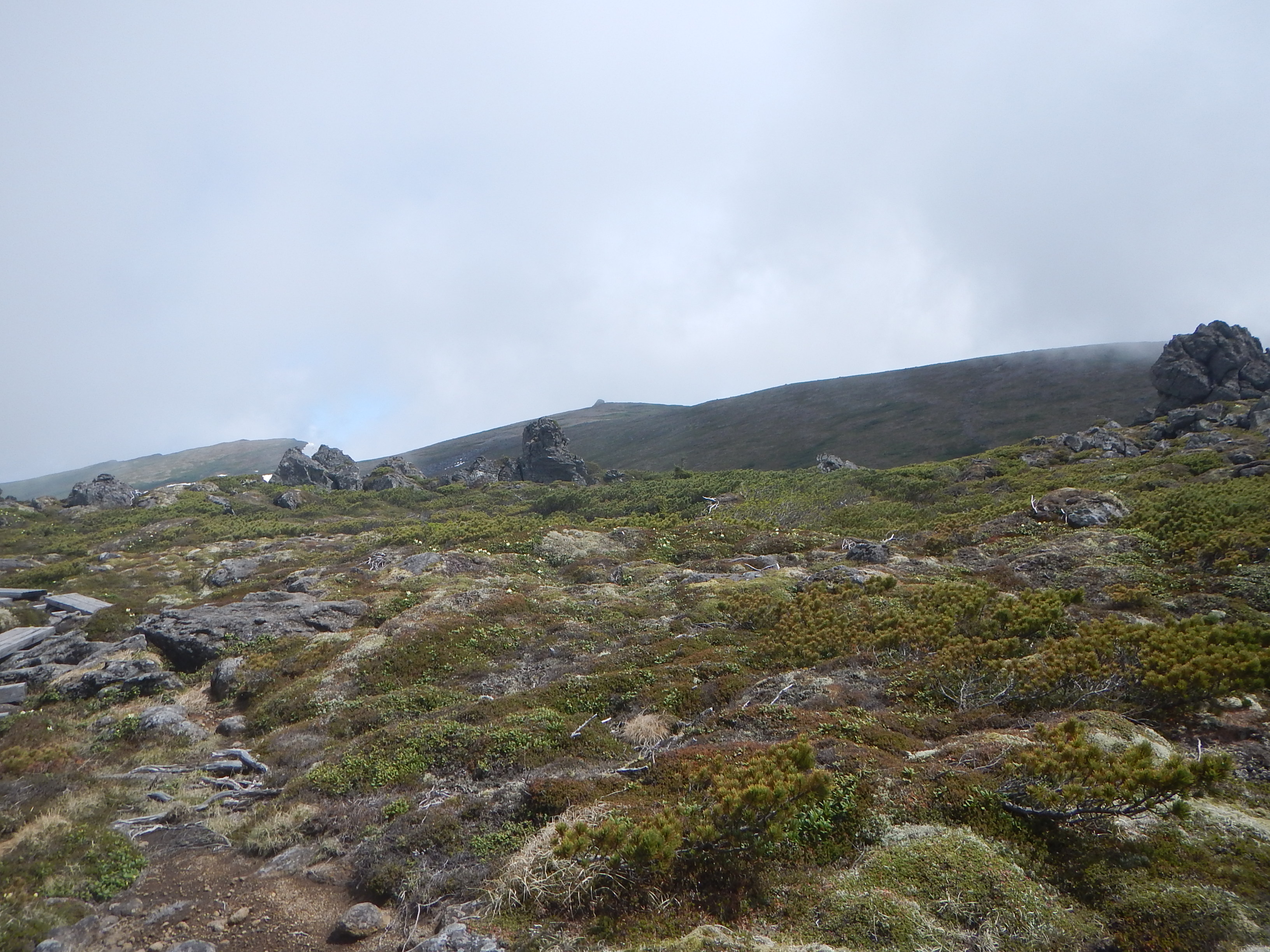 振り返るとずっとガスの中だった、十勝岳山頂が見えるようになる。