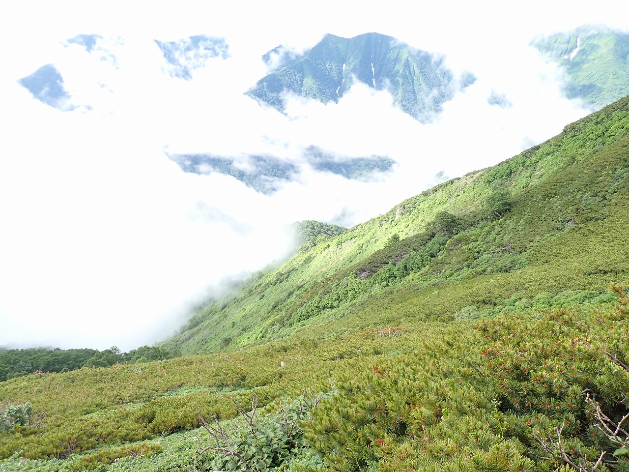 7/24(金)テントを打つ雨音で目覚めるが、撤収の頃には上がる。下山は9ノ沢だが、ピパイロから直の下降は0.5対3.5で却下。1,550のコルを回って下降することに