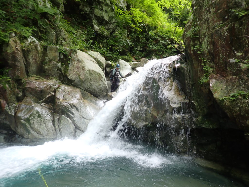 枝沢二つ目の釜、中途半端にクライムダウンをしたところドボンして、メガネを紛失!、不注意でした。二日間視力0.05で歩くはめに