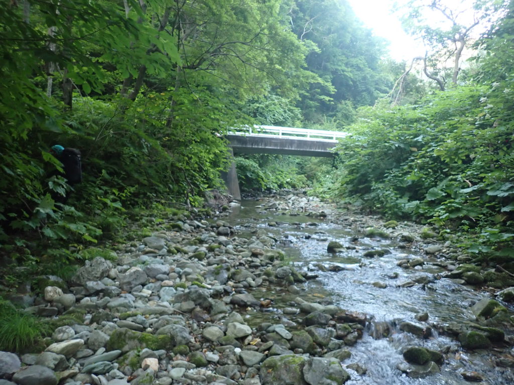 7/22 臼別温泉6:00 臼別橋(クマノ沢)6:30 本流出合7:10 co310二股10:20 co480二股(天場)12:30