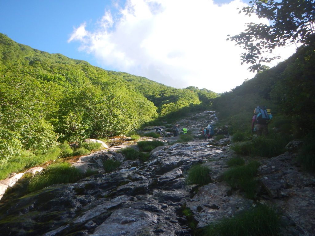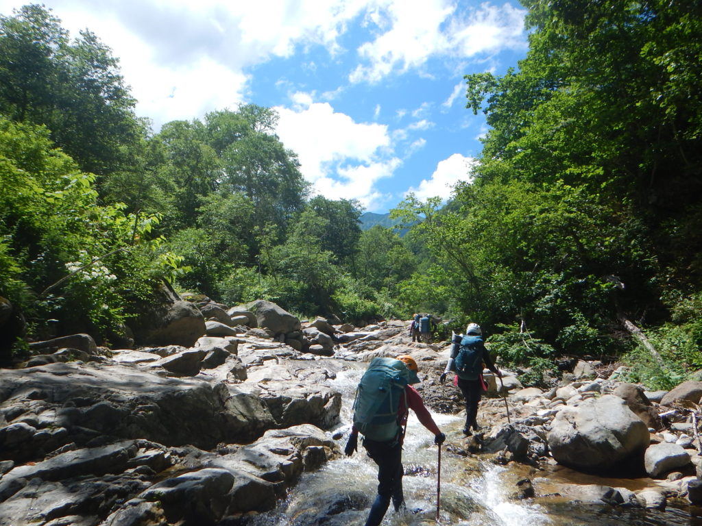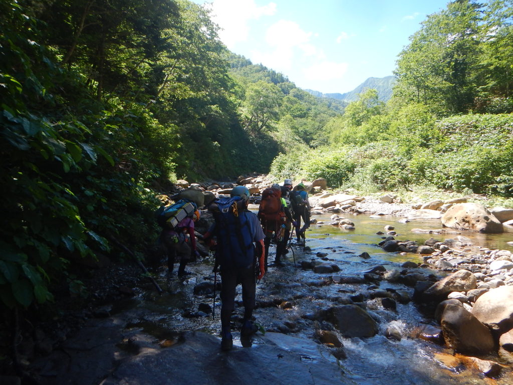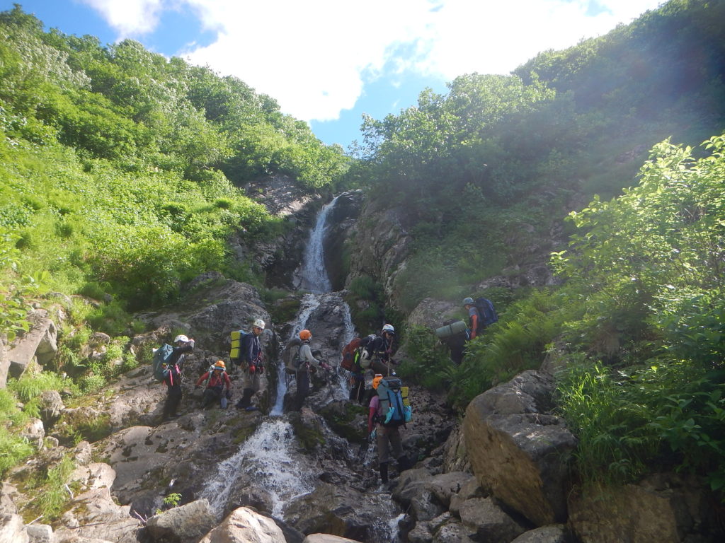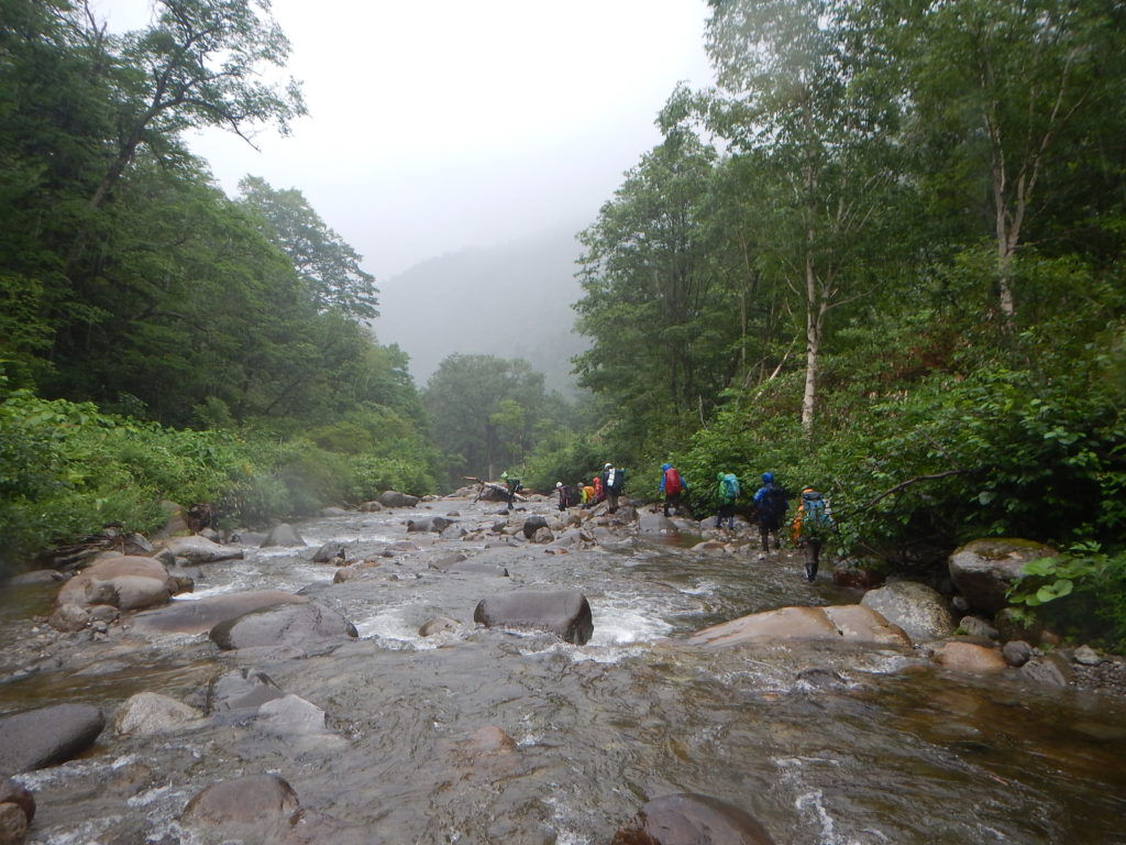 今回のエサオマントッタベツ岳は3パーティー10人となり、内7名が初めての山域だ。この日帯広地域の最高気温は35℃にもなり沢を遡行していても、熱中症になるような暑さだった。そのせいか身体の消耗が大きくかなり辛い山行となった。