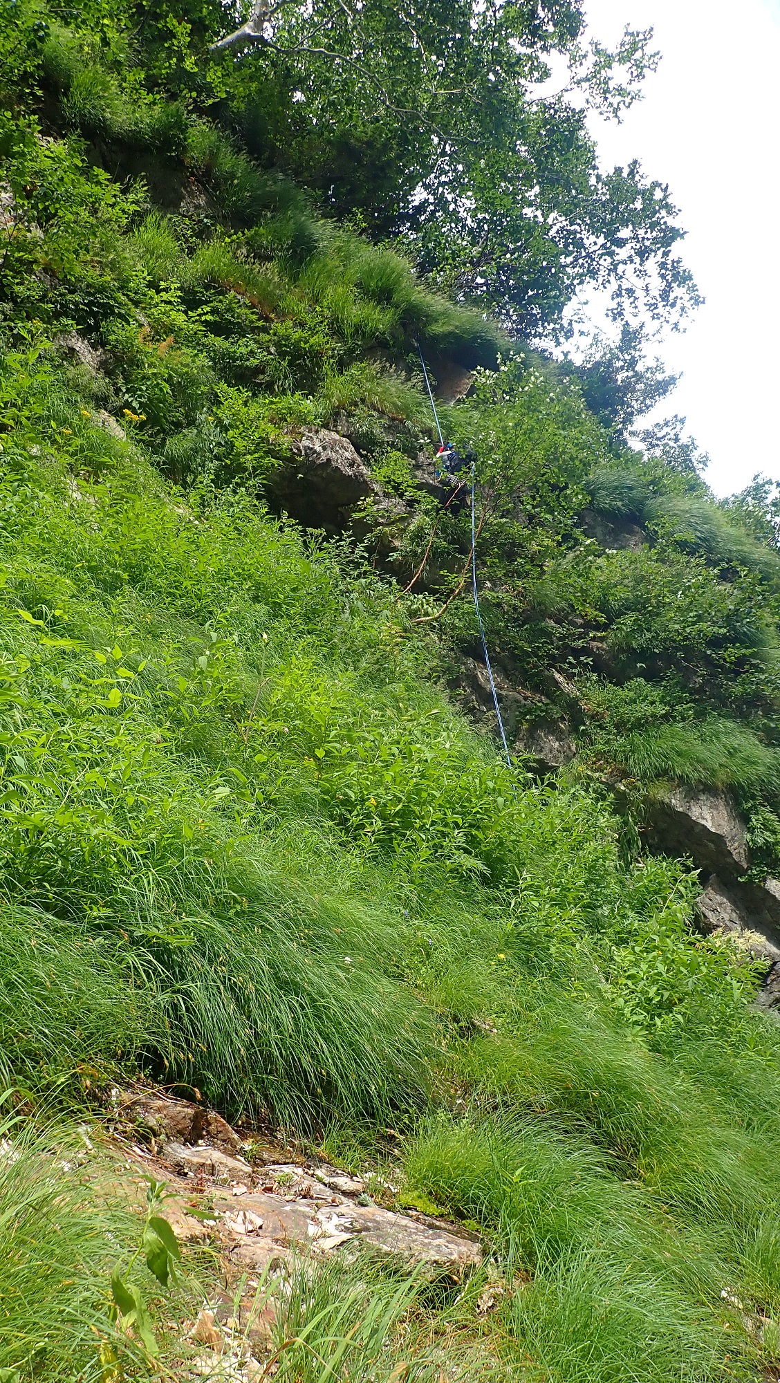 数十分の高巻で、適当なところから懸垂。途中残地ロープあり