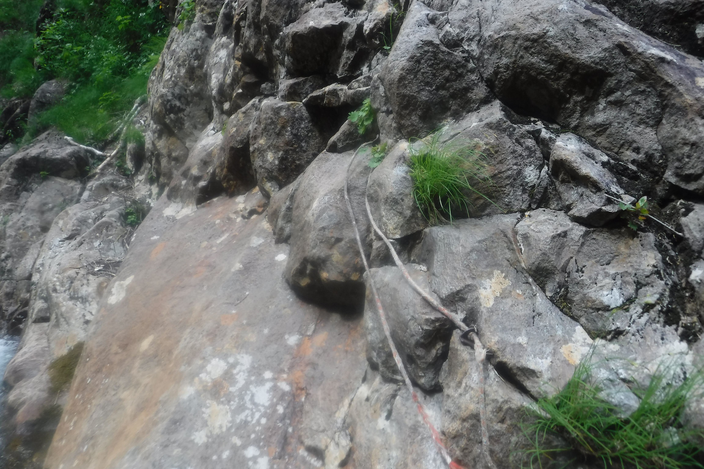 最初の核心部のチョックストーンの滝。 右側の草付きもなかなか!
