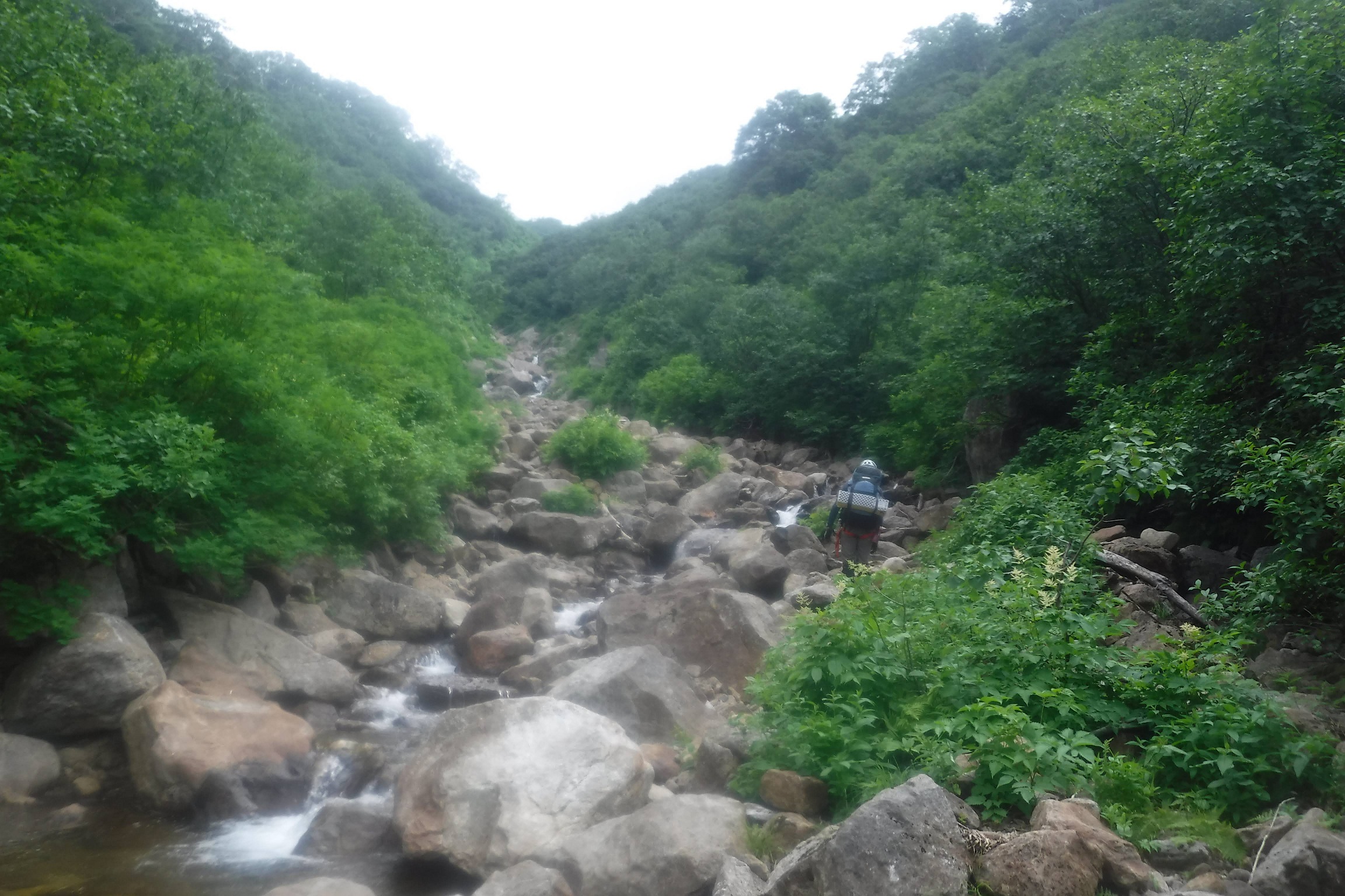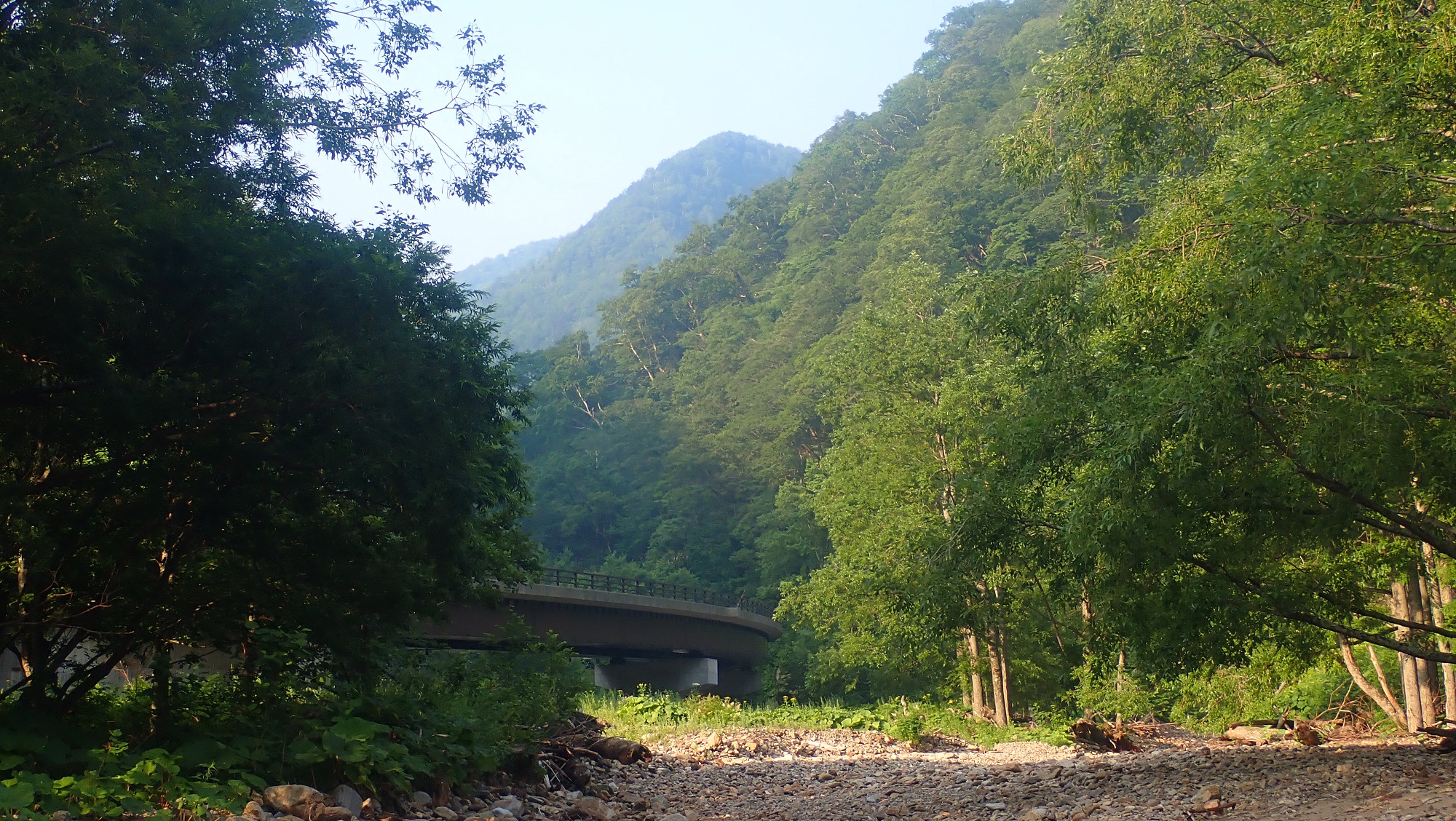 初めてのカムエク。ちょっとМ気質の我々は九ノ沢からの遡行を計画しました!この日も真夏日の予報で、前泊した札内ヒュッテを早朝出ましたが、林道歩きから……いや、身支度の最中から汗がじんわり。