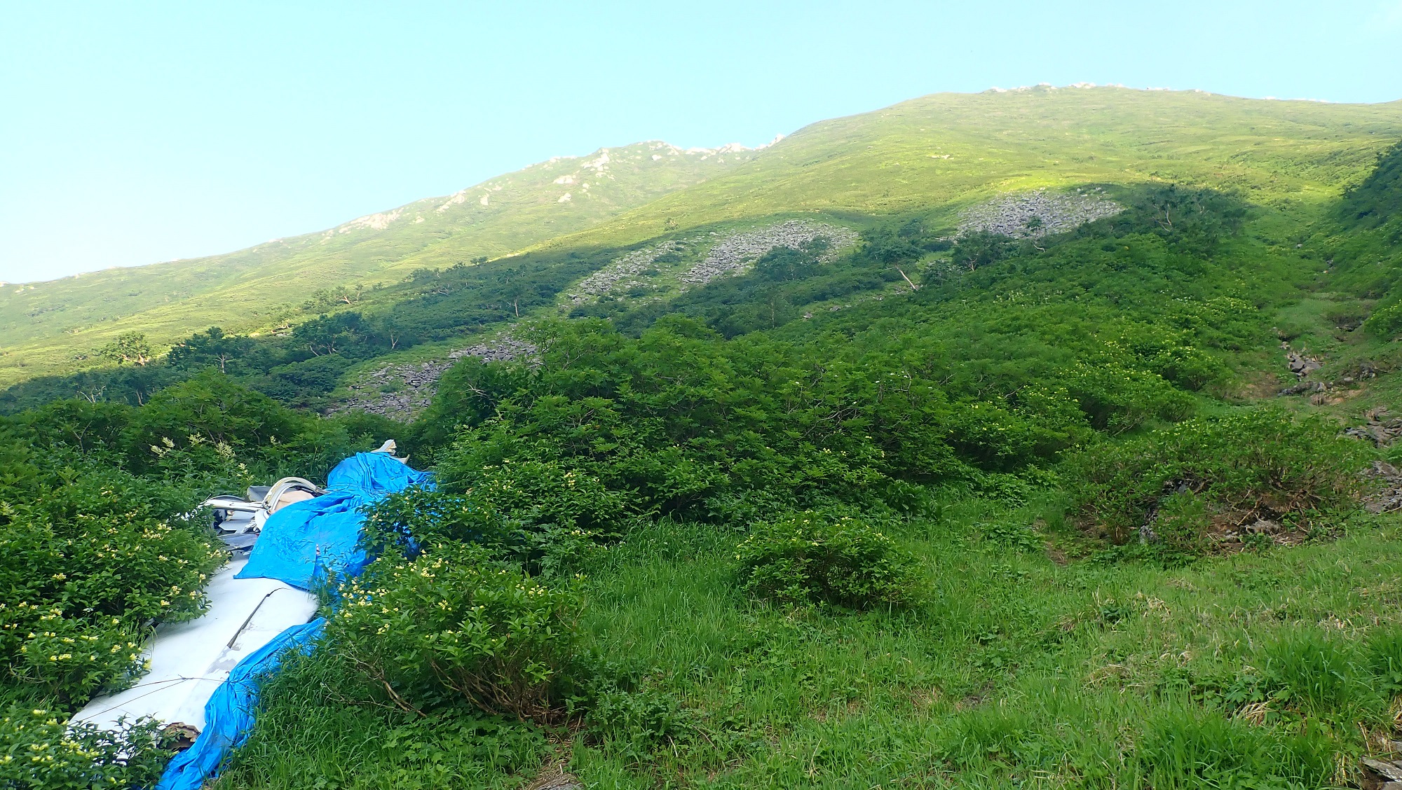 原始的な日高のカールとは対照的な、グライダーの残骸。