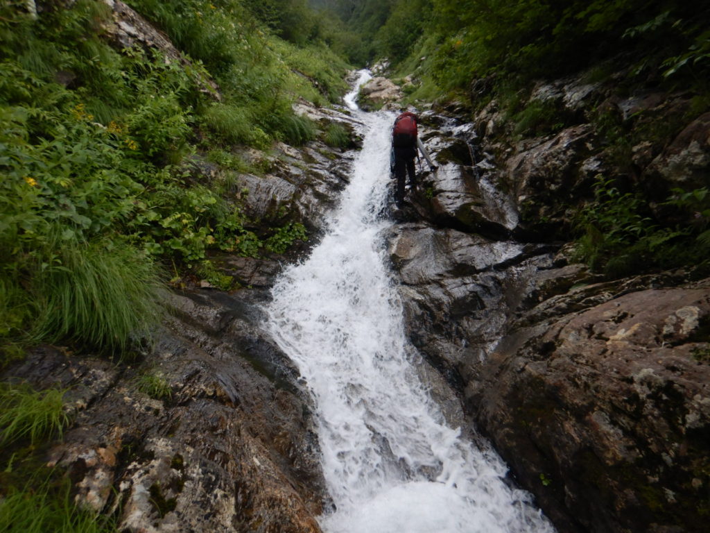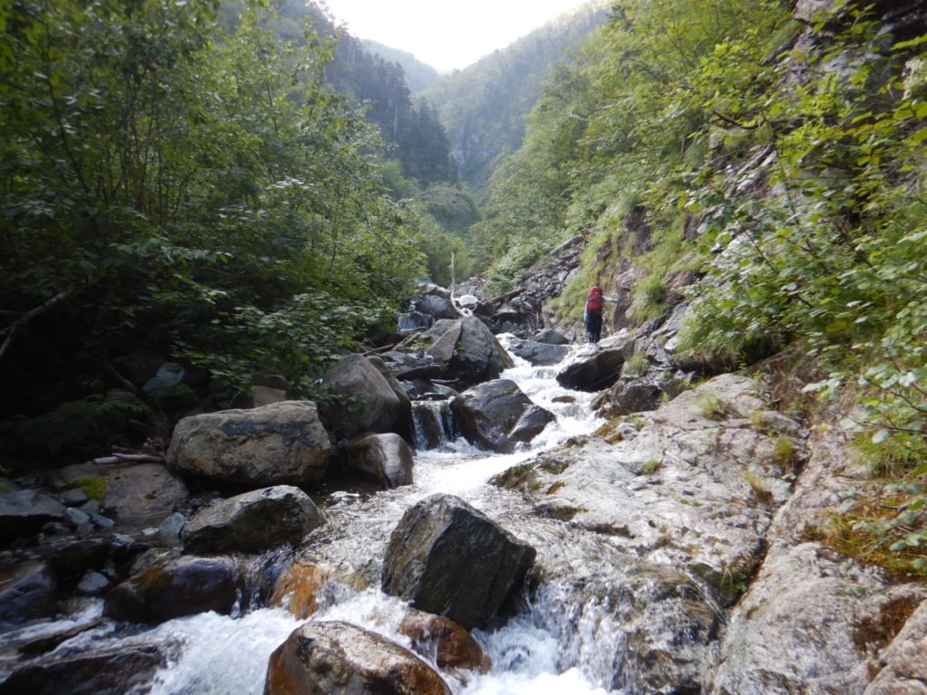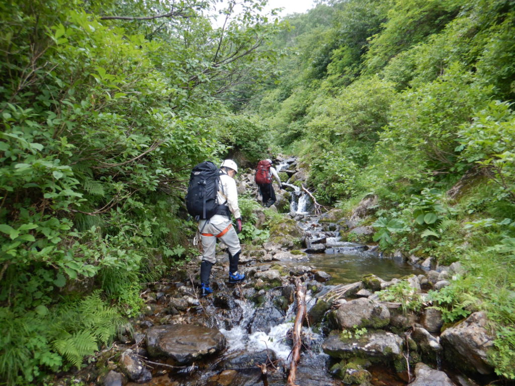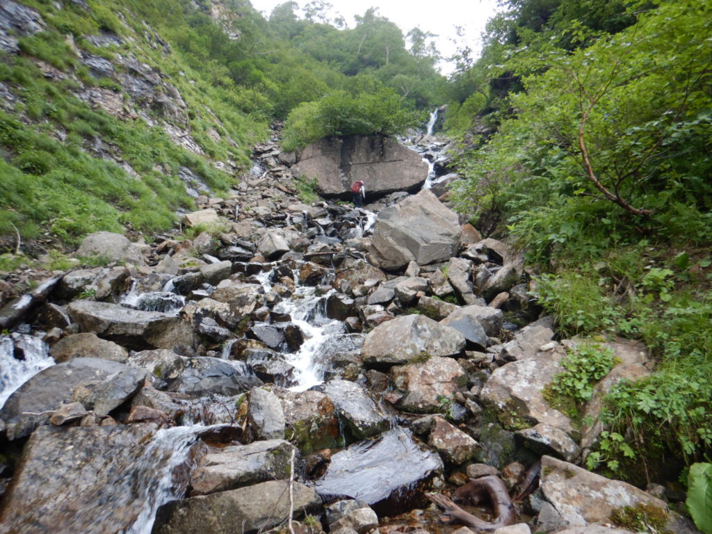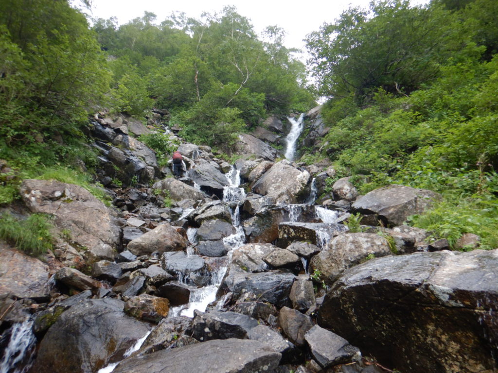 一泊二日の予定でカールに泊まる計画がカールに早く着きすぎたので、稜線に泊まることになり水を持ち上げた。稜線の良いテン場はガイド登山のテントが二張り、張るスペースも無いので下山することにしたが、持ち上げた水は無駄になってしまった。結果は泊まり装備を背負っての日帰り登山、年寄りにはきつかったが、この沢は十分日帰りの範囲内だ。