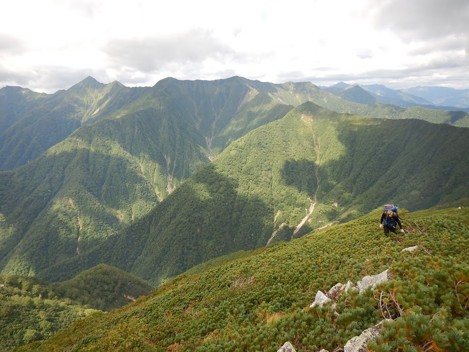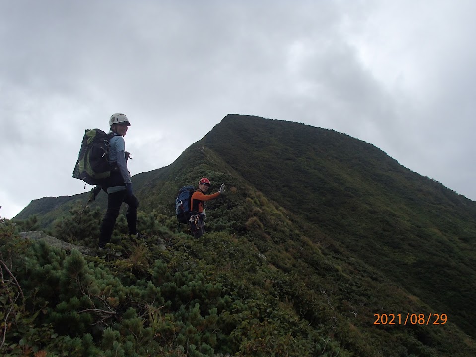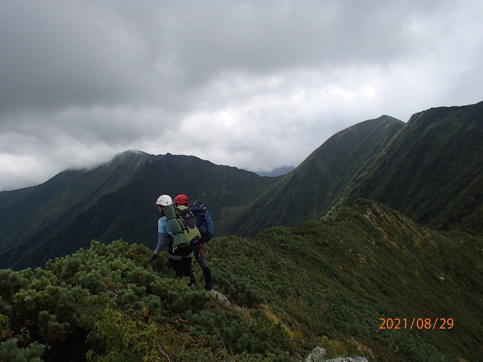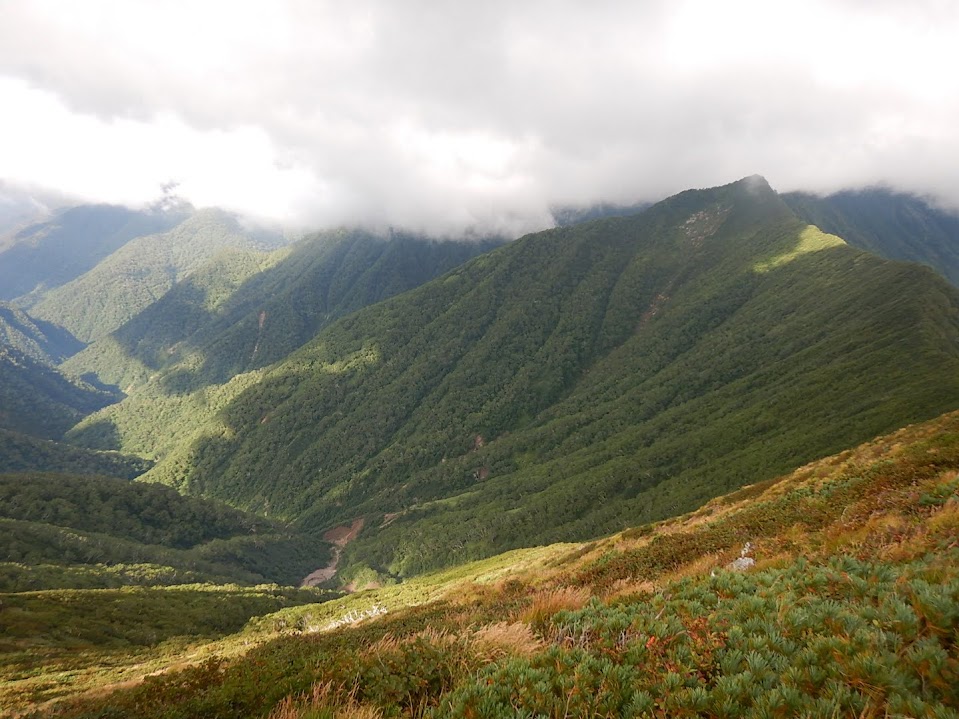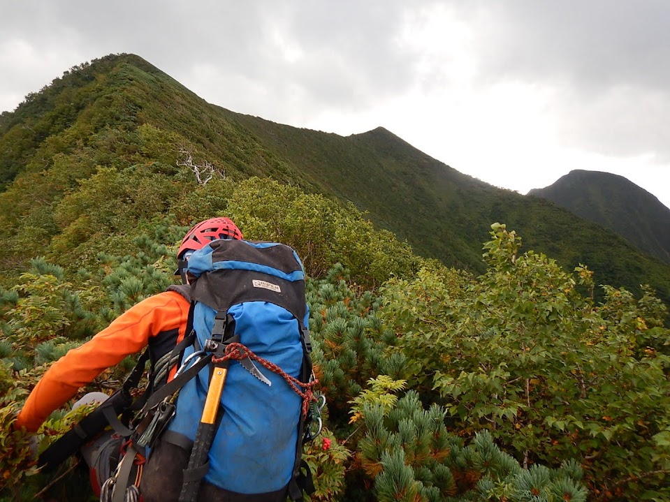 5:30 出発~5:40 高巻き~8:05 1599峰山頂~10:45 ヒグマ遭遇~12:30 ルベツネ山頂~14:15 Cカール~17:10 915m、C2