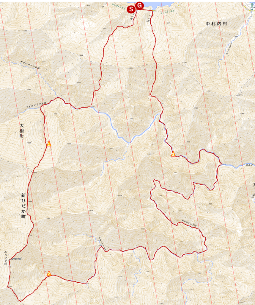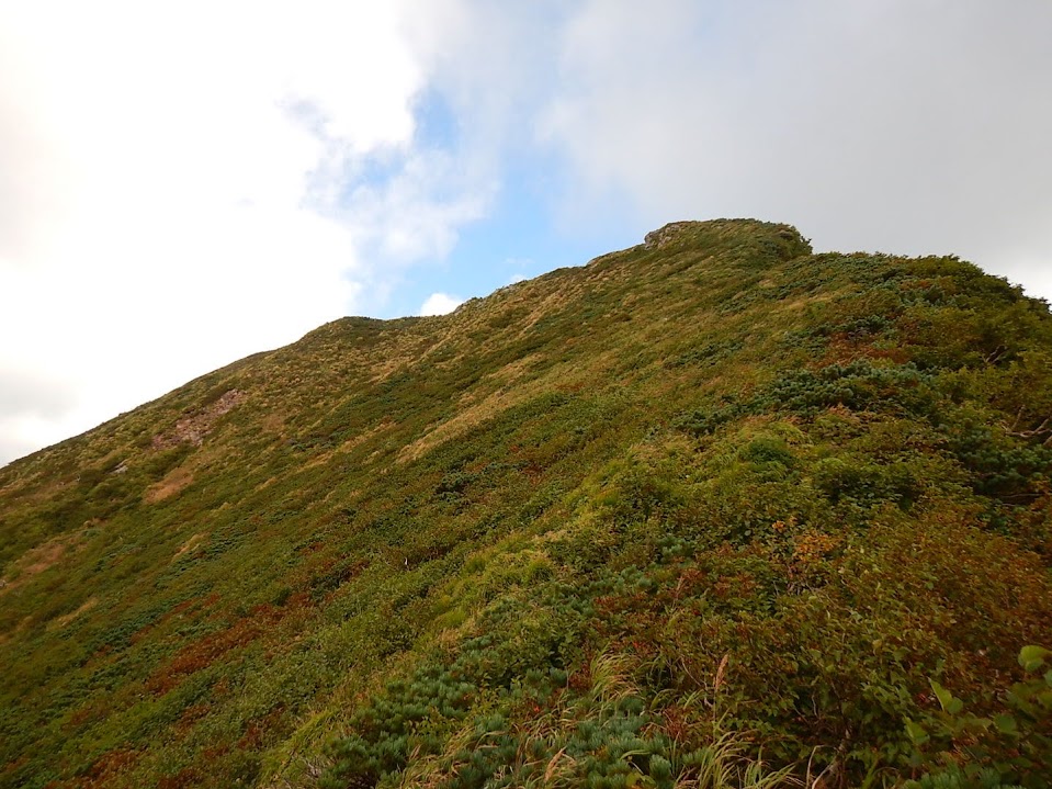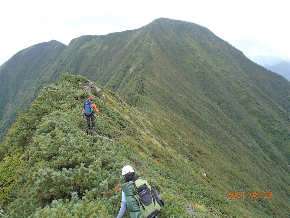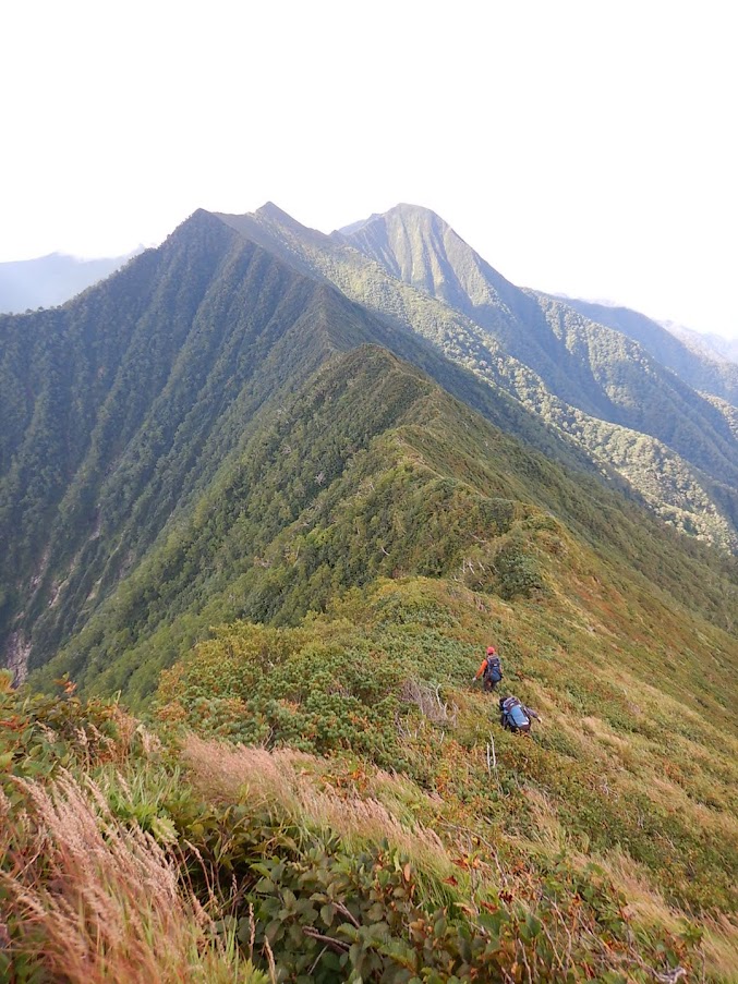 5:30 出発~5:40 高巻き~8:05 1599峰山頂~10:45 ヒグマ遭遇~12:30 ルベツネ山頂~14:15 Cカール~17:10 915m、C2