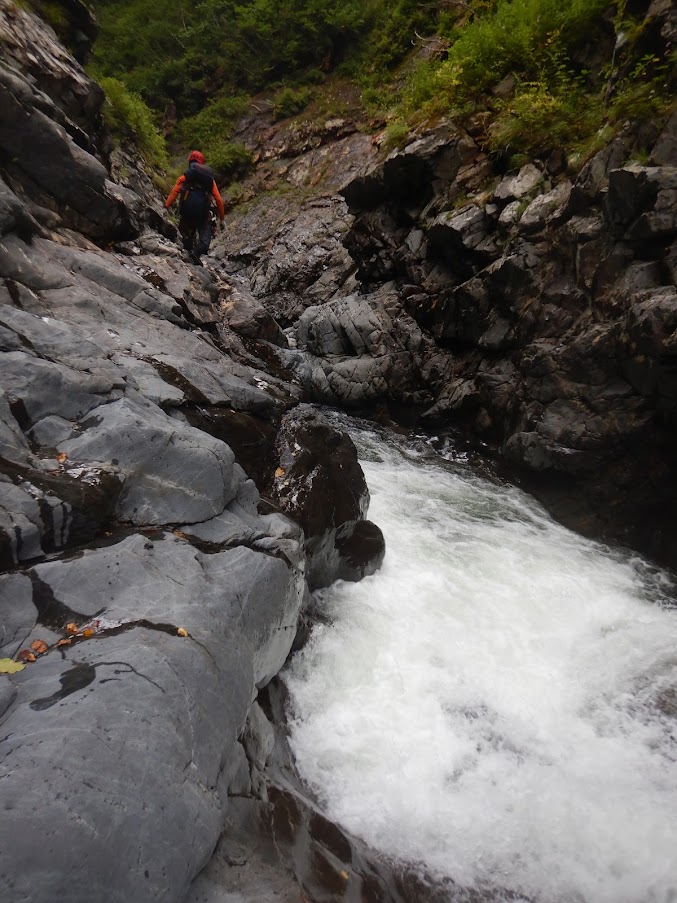 正面のスラブではなく、右から合流してくる沢が本流。…危ない