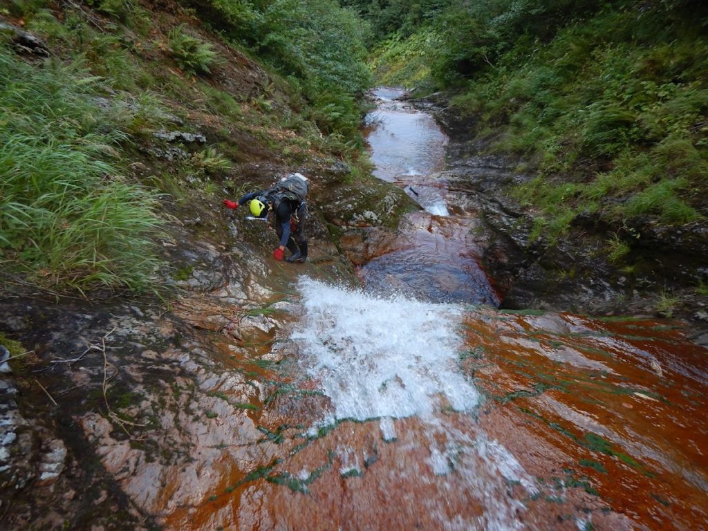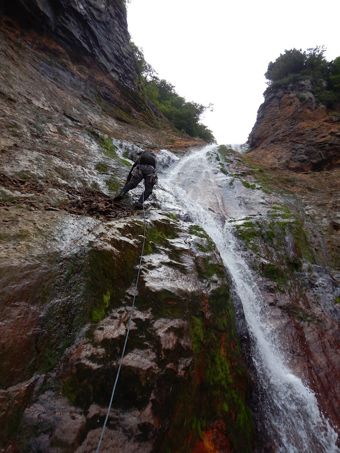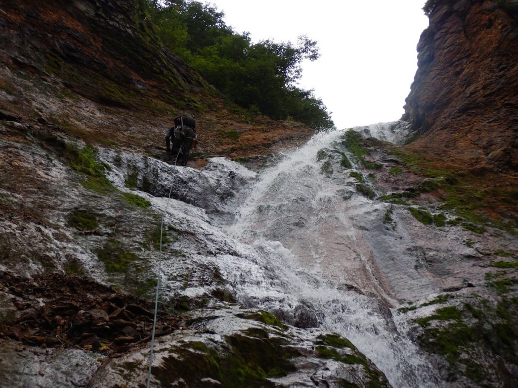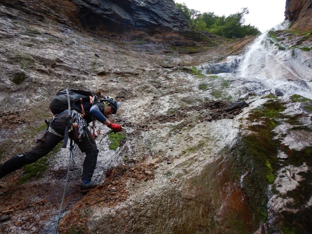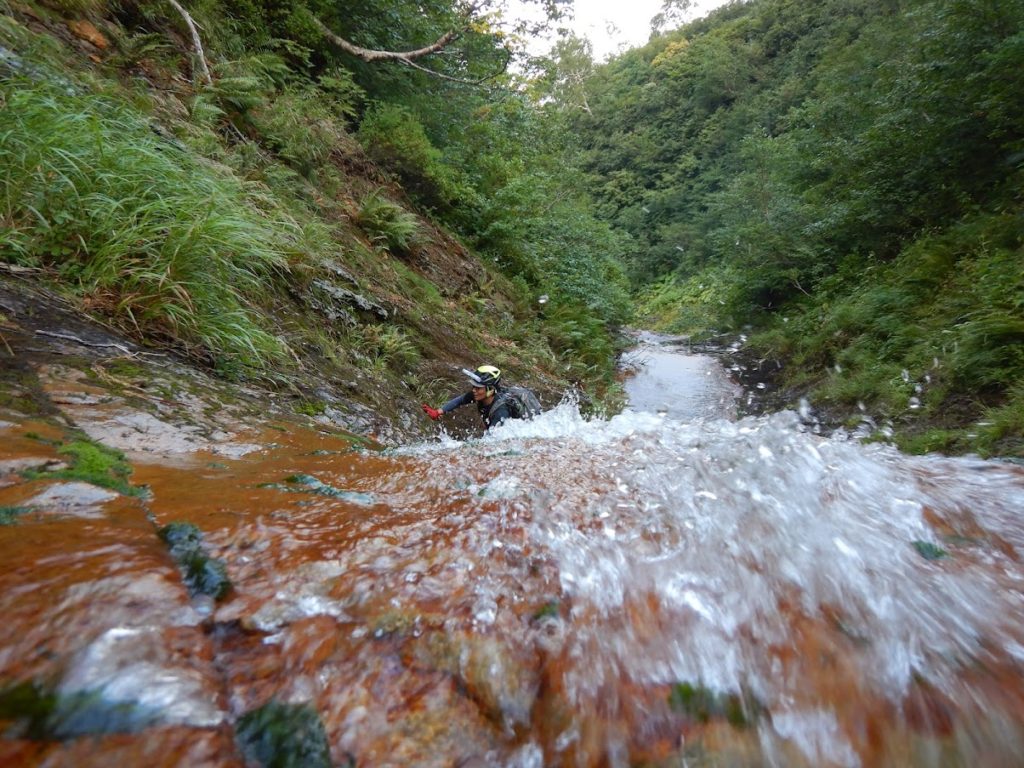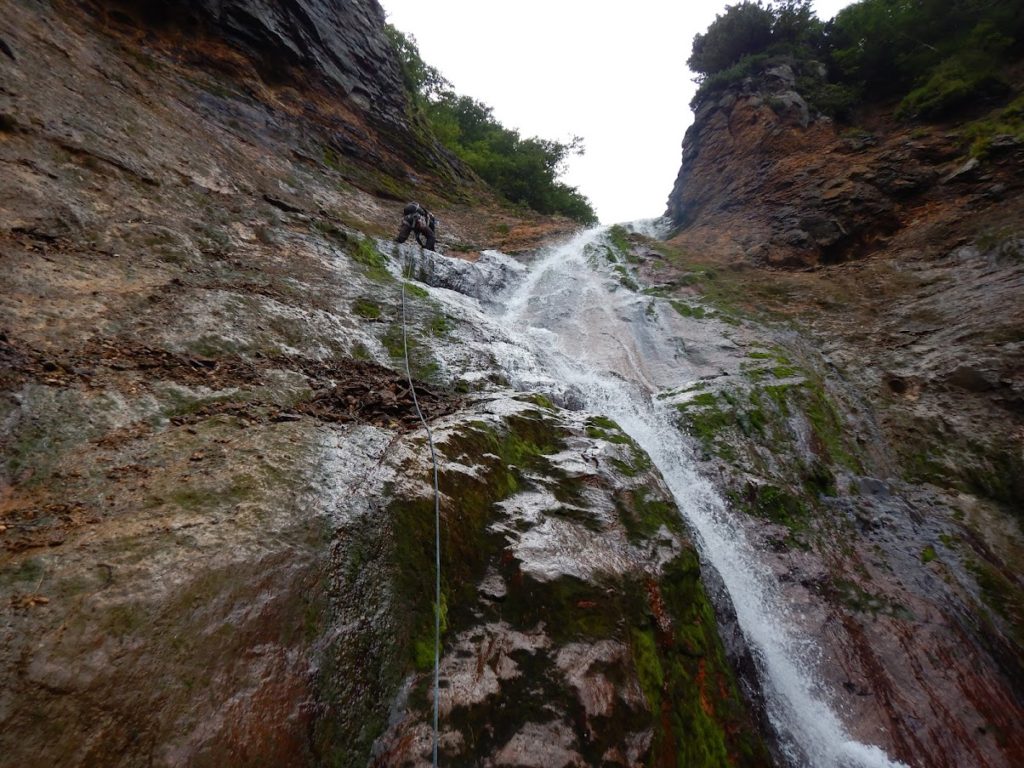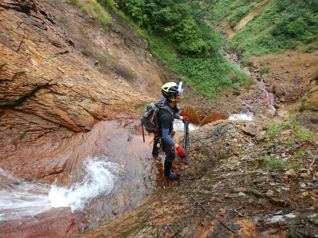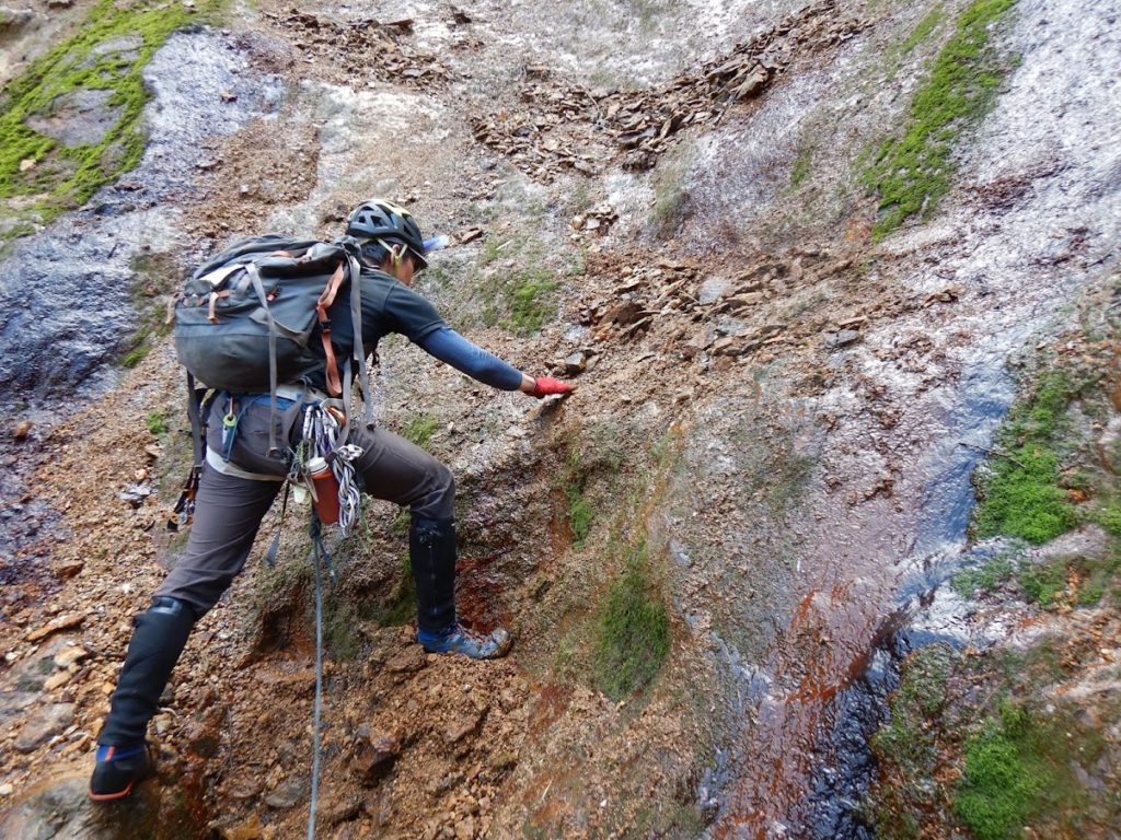 上部のケヤマハンノキでビレイしてもらうと、30mギリギリ