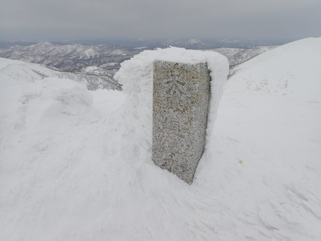 アイゼンをつけて岩場ステップを越えてると頂上稜線から右手に前天塩岳が見えてきた。
