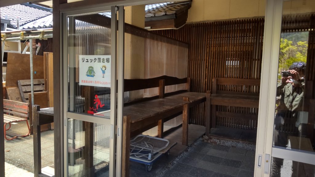 ここの温泉で登山者は上客。ザック置き場や靴の洗い場もある。ちなみにガラスに亡霊のように写り込んでいるのが私。失礼しました。