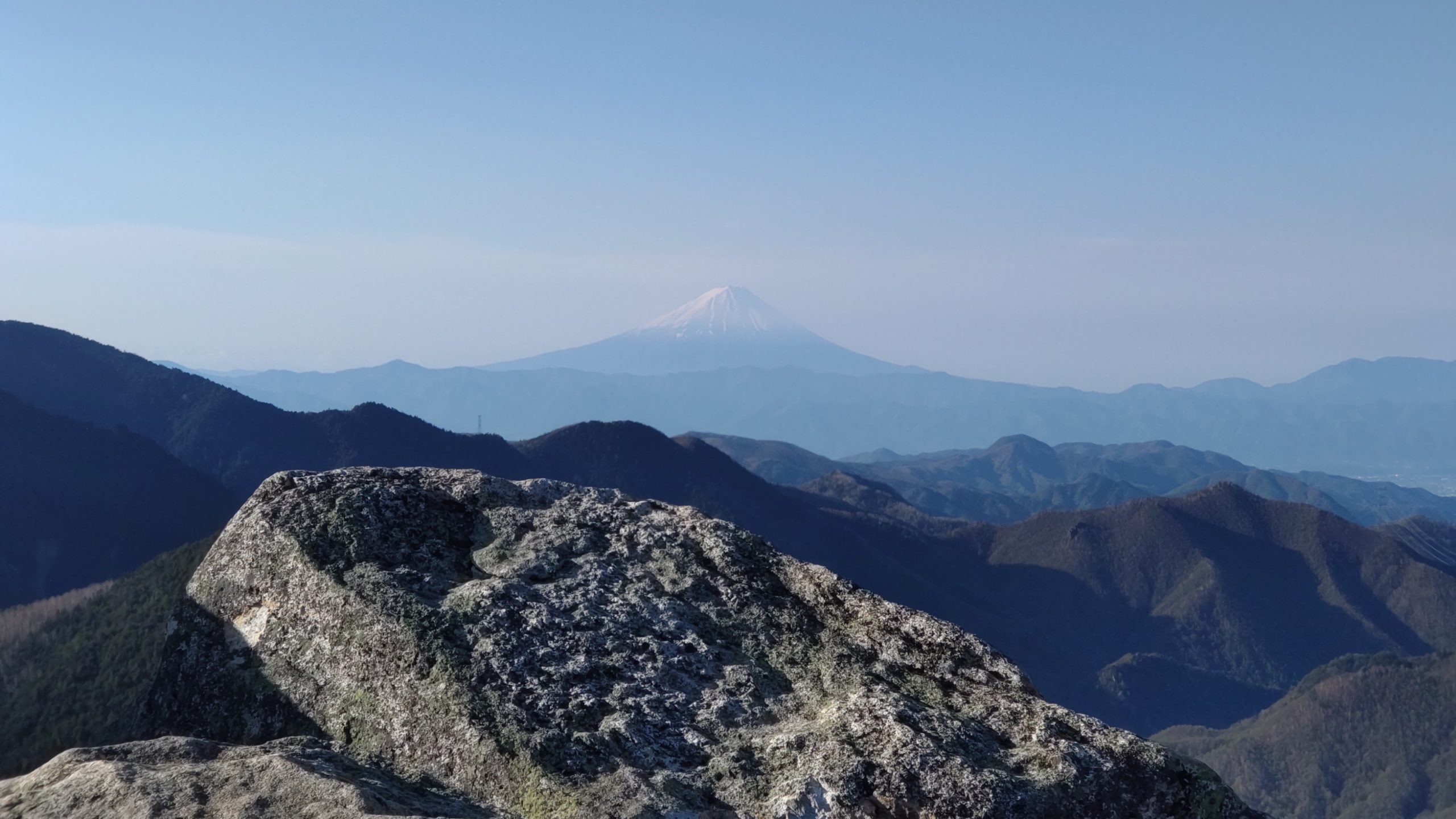 瑞牆山頂から金峰山を望む。とんがった五丈岩の存在感が凄い。ご神体として崇めたくなる気持ちがわかる瞬間。