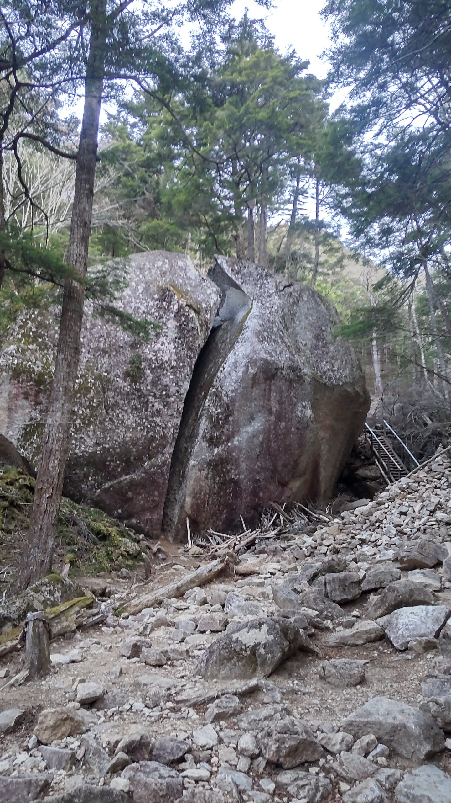 有名な五丈岩。わかりにくいが岩の下に鳥居が見える。サイズ感を(無理やり)