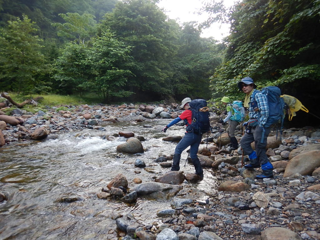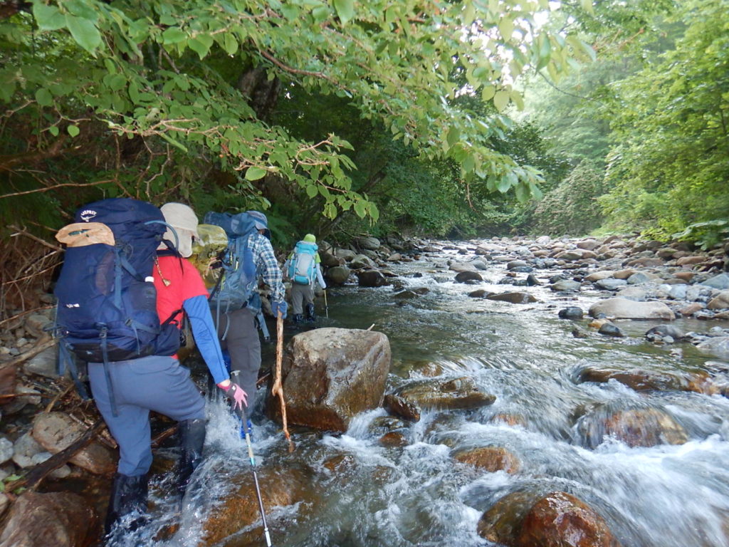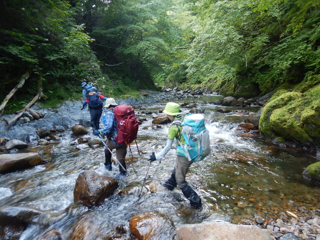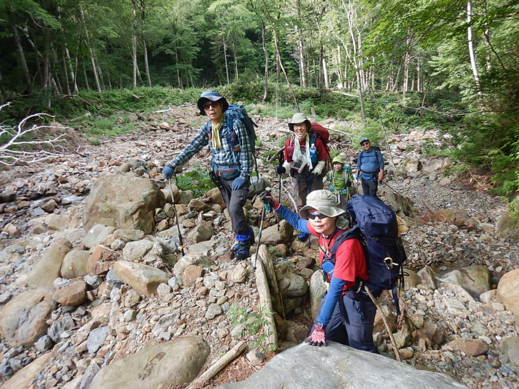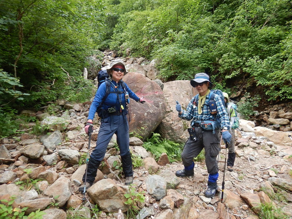 山荘390mから取りつき760mまでは沢沿いに渡渉しながら高度を上げていく。しかしルーファイに難渋し取りつきまでに時間を要してしまった。下山時に巻き道とピンクテープを発見し一同「登りで気が付いていたらな~!」と悔しがった。でもいい経験になった。