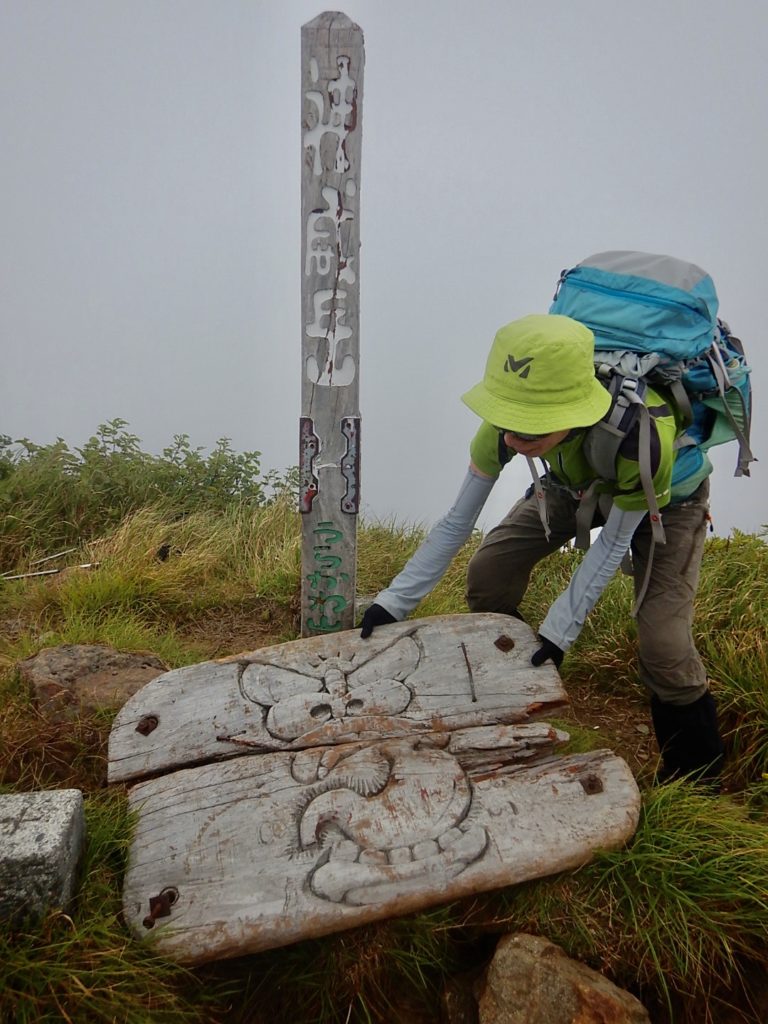 山頂標識の看板裏の絵(最後から2枚目の写真)だが竜が胃を噛んでいる絵だそうだ。「胃を噛む」→「噛む胃」→「神威」らしい。誰が言ったのか謂れもわからない。さてさて下山です。下山時には暑さも増し熱中症を懸念し水分、塩分、休憩を充分に取りながら予定の時間を超えたが無事下山できた。