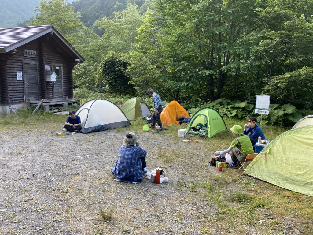 神威山荘が登山口になる。しかしそこまでの元浦川林道は大雨などで林道崩壊し通行止めになることがある。何回も森林管理署に確認の上、林道を慎重に運転し山荘に前日到着しテント泊した。
