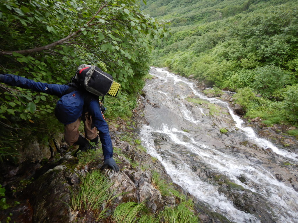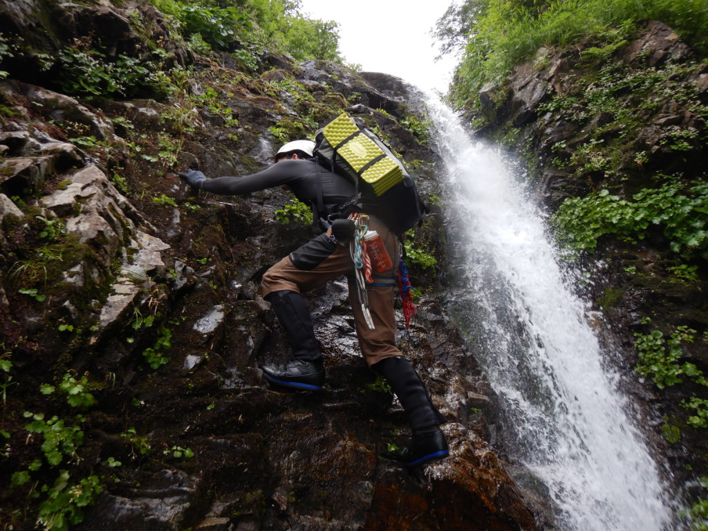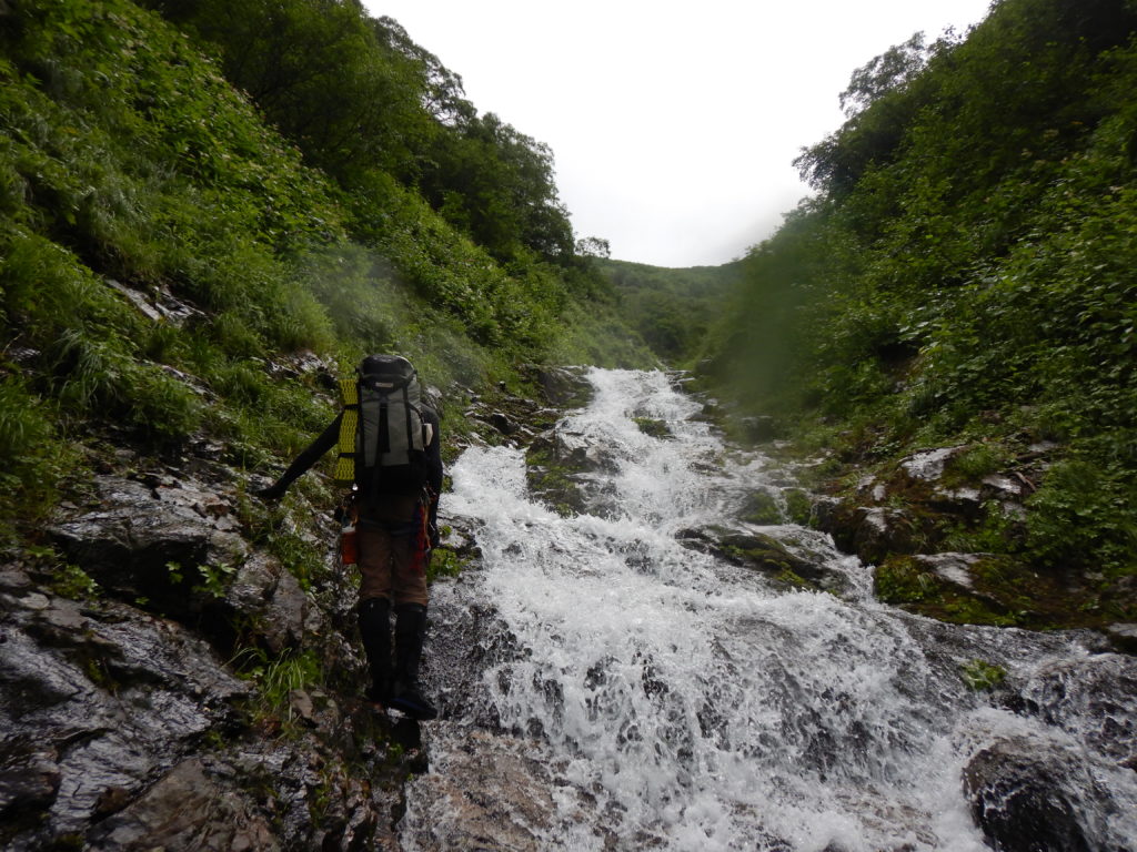 振り返ってみると、間違った沢をそのまま稜線まで突き上げて、稜上から山頂向かえばよかった。だけど間違いが発覚した時には、本流と山スキー沢出合の時点で間違えていたことに気が付かなかった。本流の上部で間違った沢に入ったかと勘違いに勘違いが重なり、一番苦労するルート取りになってしまった…。あらゆる枝沢が滝となって合流してくる様相に、翻弄されたのかもしれない。読図と増水した沢の難しさを感じる山行だった。