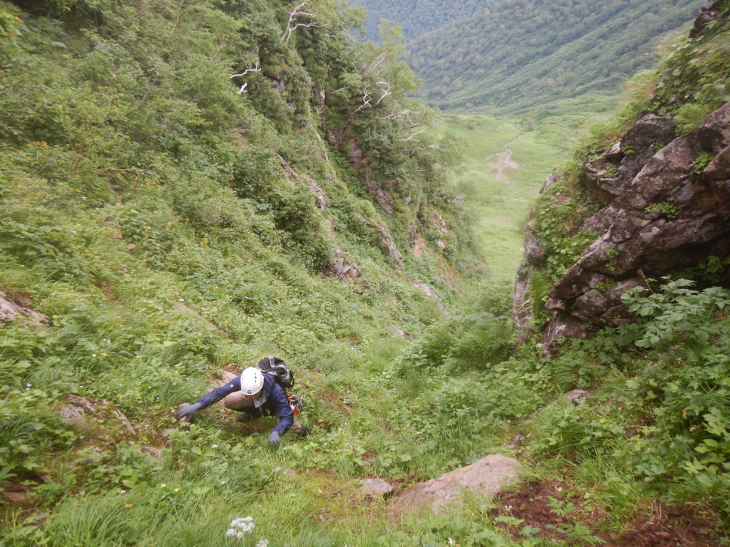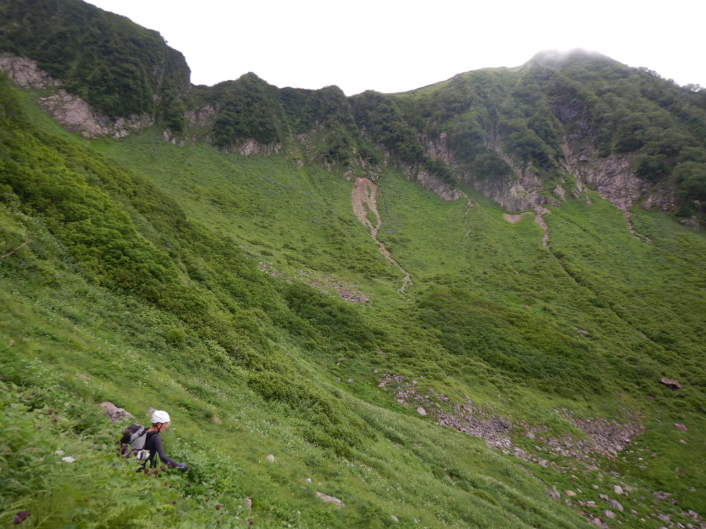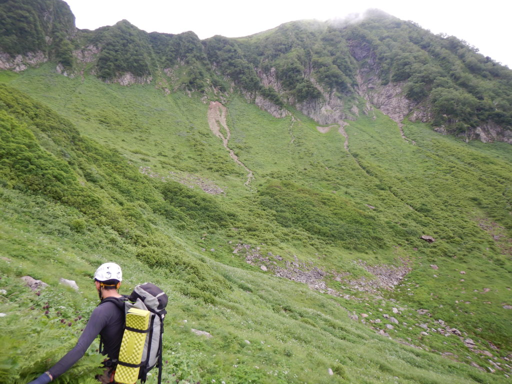 いくつもの尾根と沢をトラバース藪漕ぎして、カールに向かう
