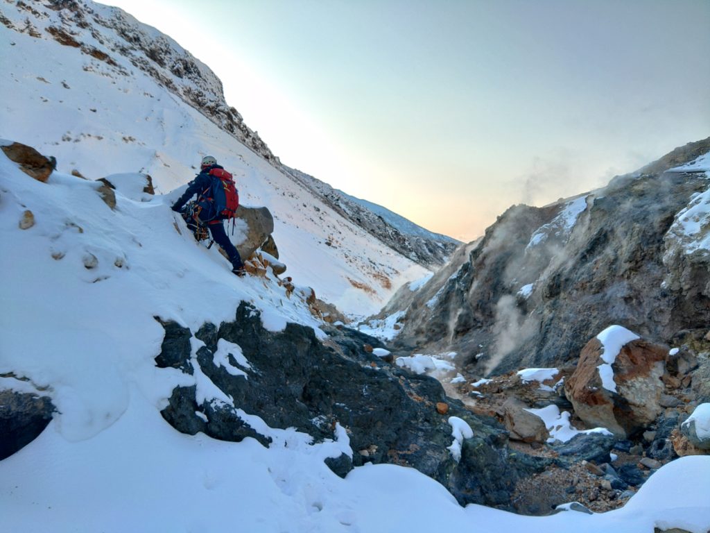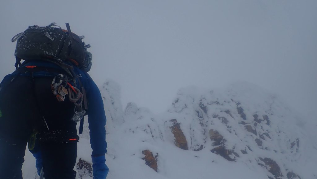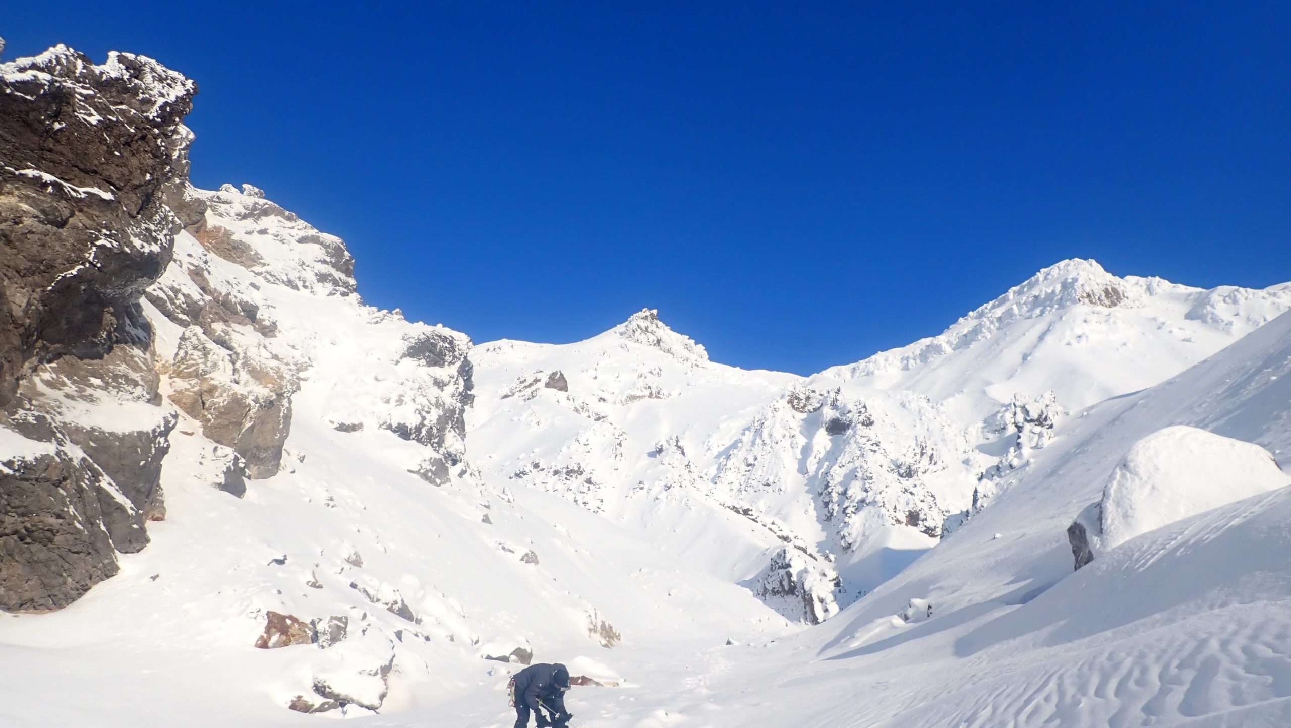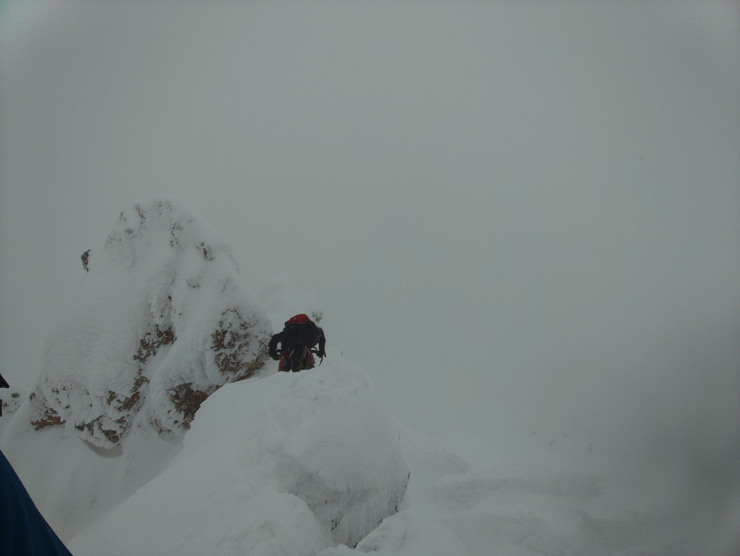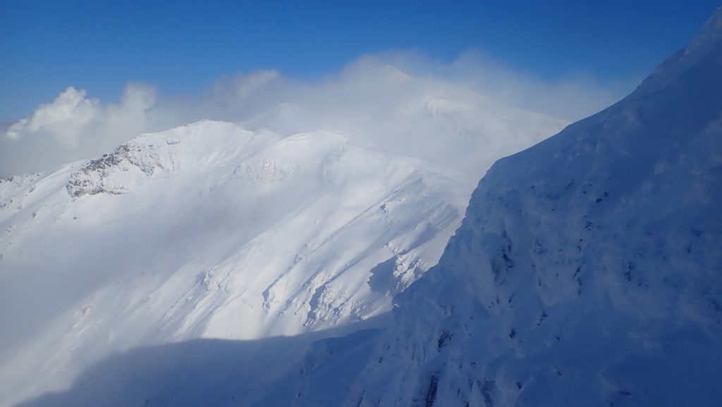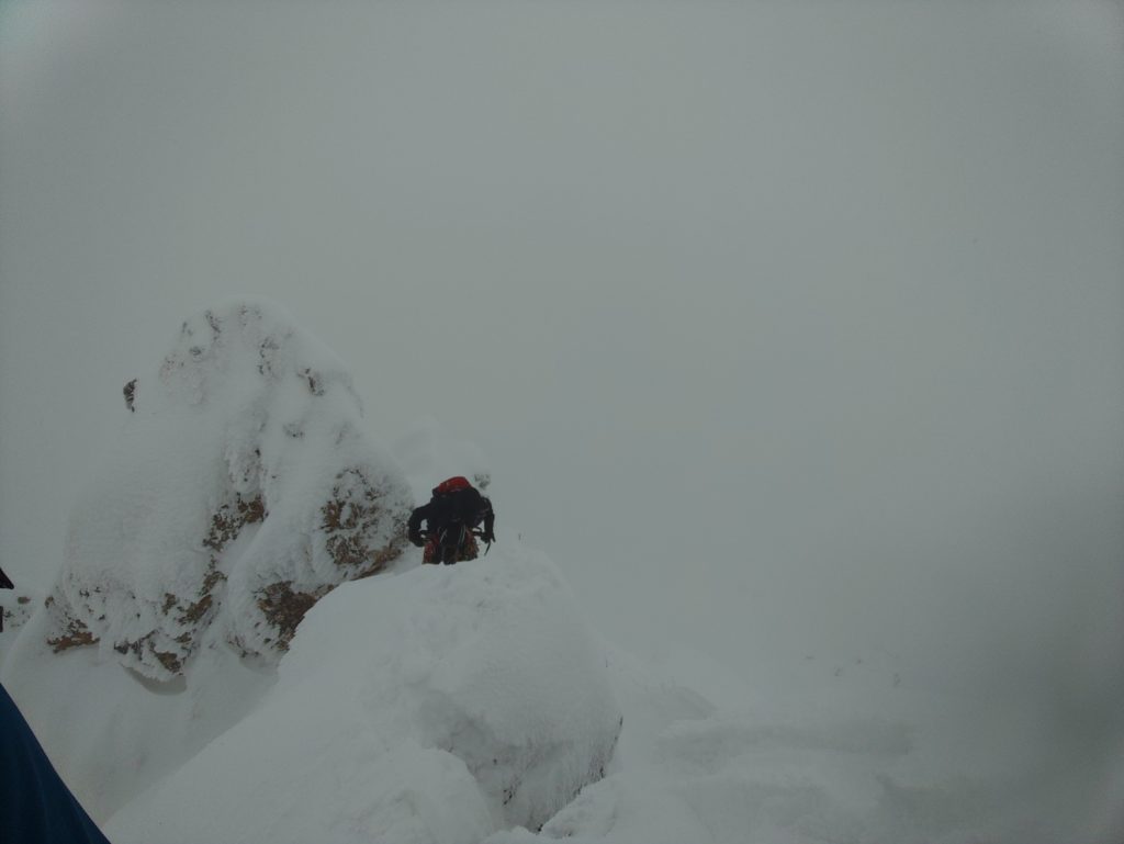 雪稜も雪は少ないが割と歩きやすく安定。この頃から下山は下降ルンゼでいいかもと思い始める